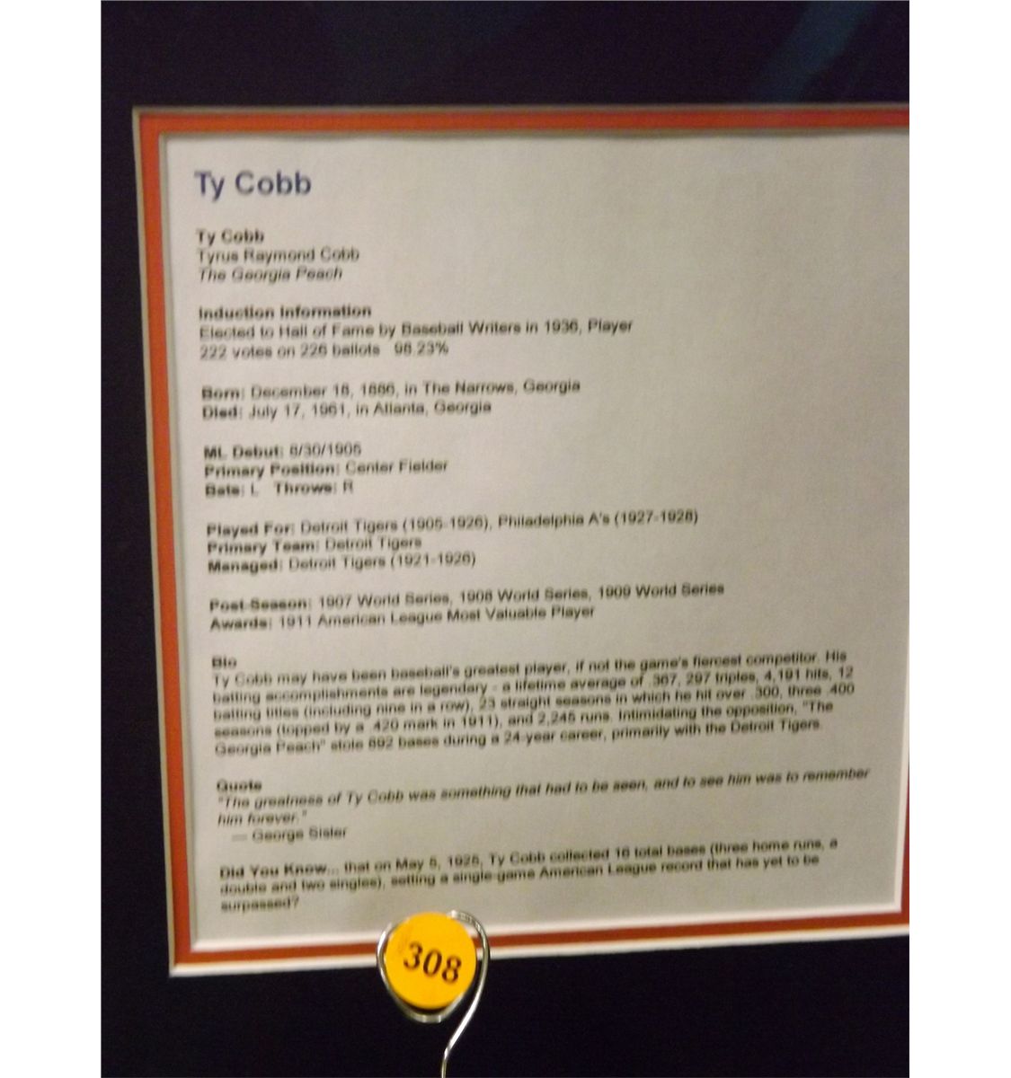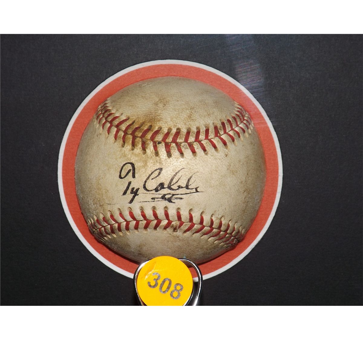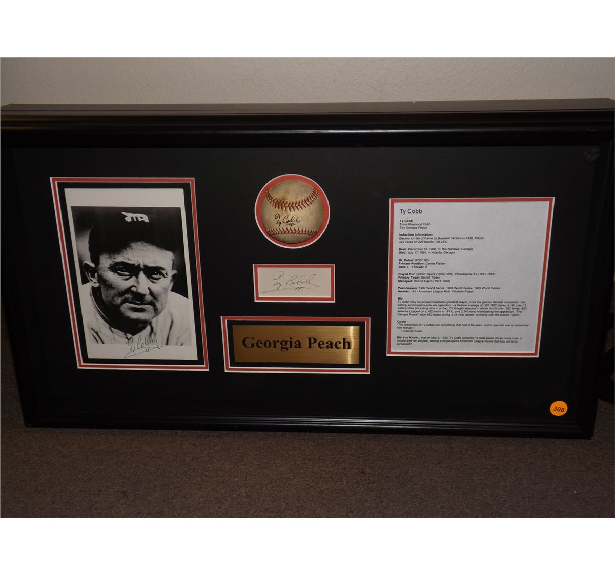 Ty Cobb Display. Framed Shadowbox with Autographed Ball, Photo and Die-Cut Signature, along with Stat Sheet. Appraised or estimated retail value $35000. COAs by Christopher Morales. All Sales Final. Please see terms and conditions of auction.