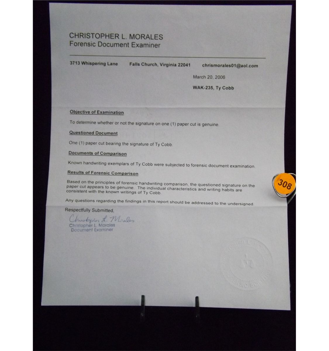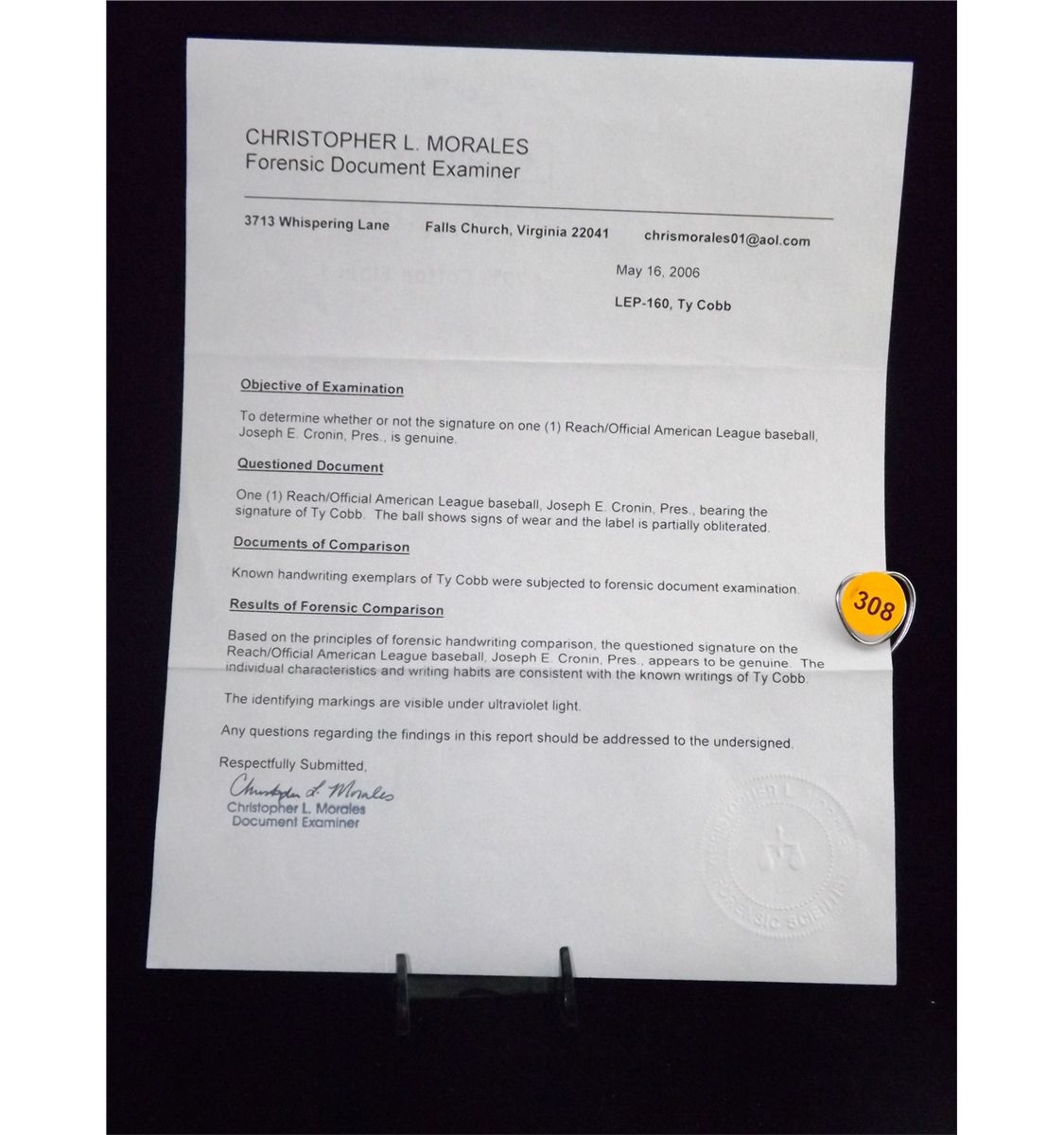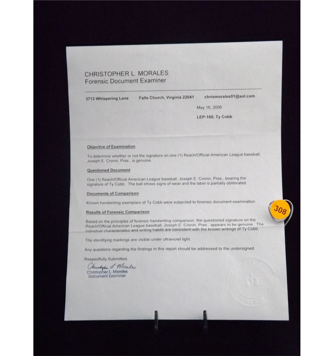 Ty Cobb Display. Framed Shadowbox with Autographed Ball, Photo and Die-Cut Signature, along with Stat Sheet. Appraised or estimated retail value $35000. COAs by Christopher Morales. All Sales Final. Please see terms and conditions of auction.