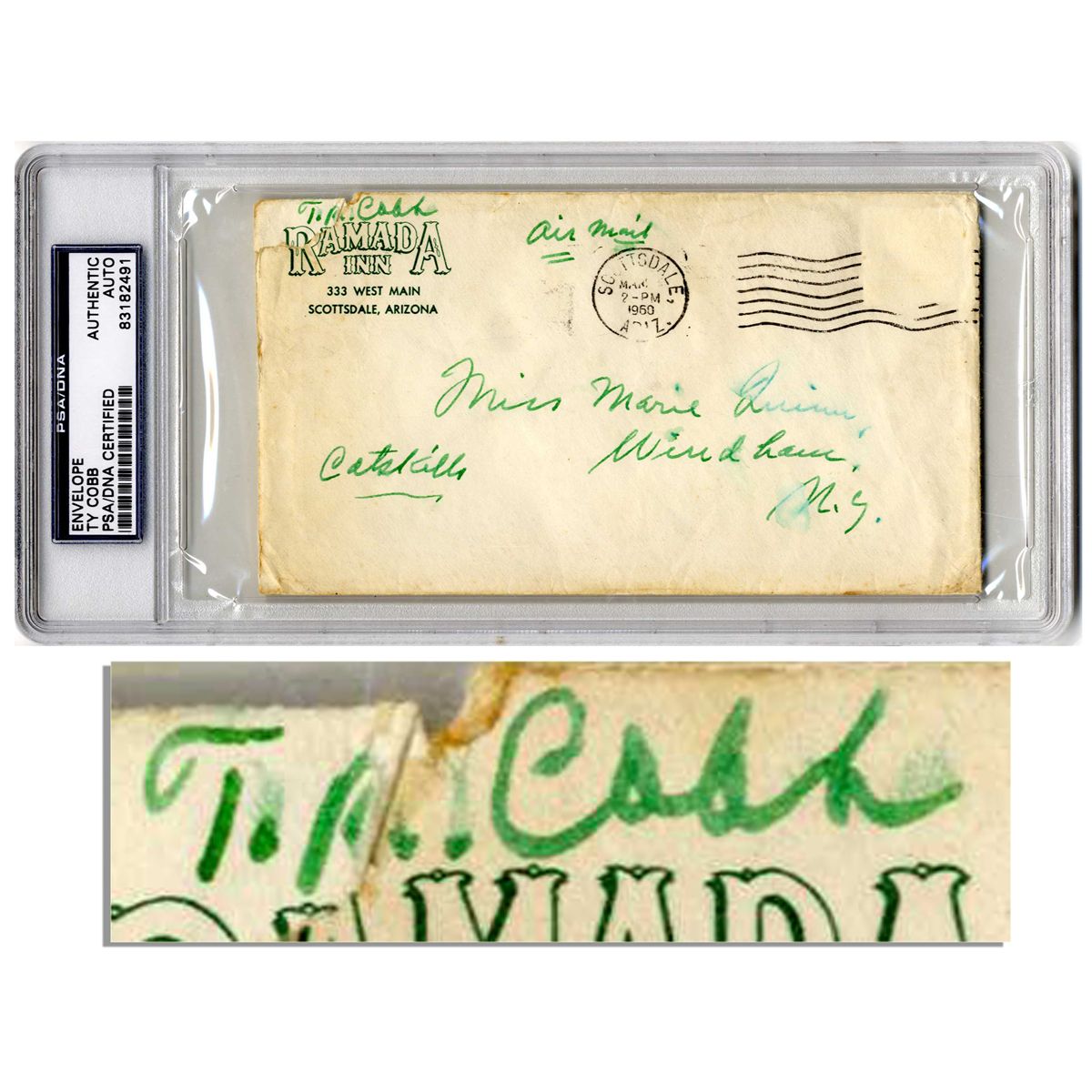 Ty Cobb signed envelope, postmarked March 1960 from Scottsdale, Arizona. Cobb hand addresses the envelope to Marie Quinn, his future live-in helper, in New York and signs ''T.R. Cobb'' above the Scottsdale Ramada Inn return address. Cobb also writes ''Air Mail'' at the top of the envelope. 6.25'' x 3.5'' envelope has tear across upper left corner, through signature. Overall very good. Encapsulated by PSA/DNA.