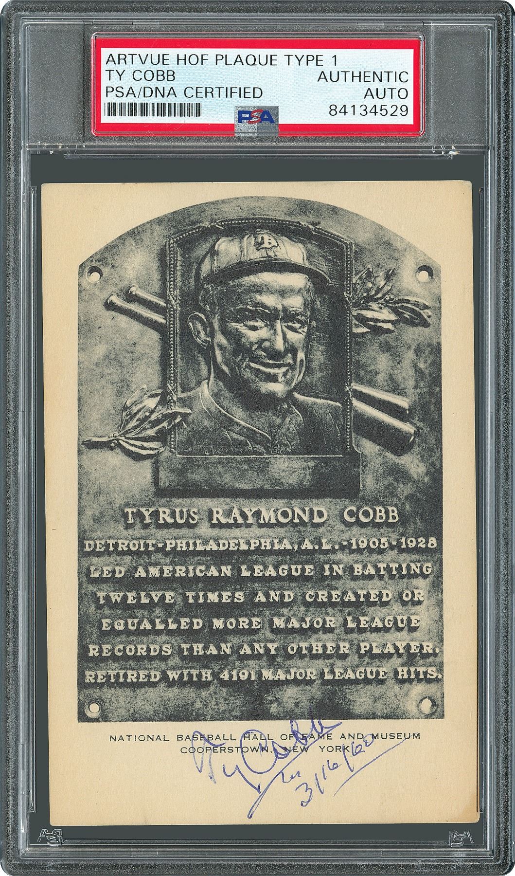 Artvue Type I black-and-white Hall of Fame plaque card, signed in the lower border in blue ballpoint, "Ty Cobb, 3/16/60," and on the reverse in his typical green fountain pen, "Ty Cobb." In fine condition, with trivial toning to the lower right corner. Encapsulated in a PSA/DNA authentication holder.