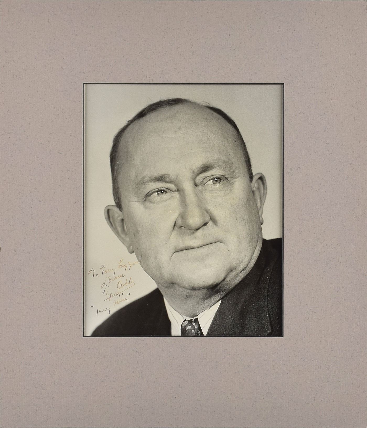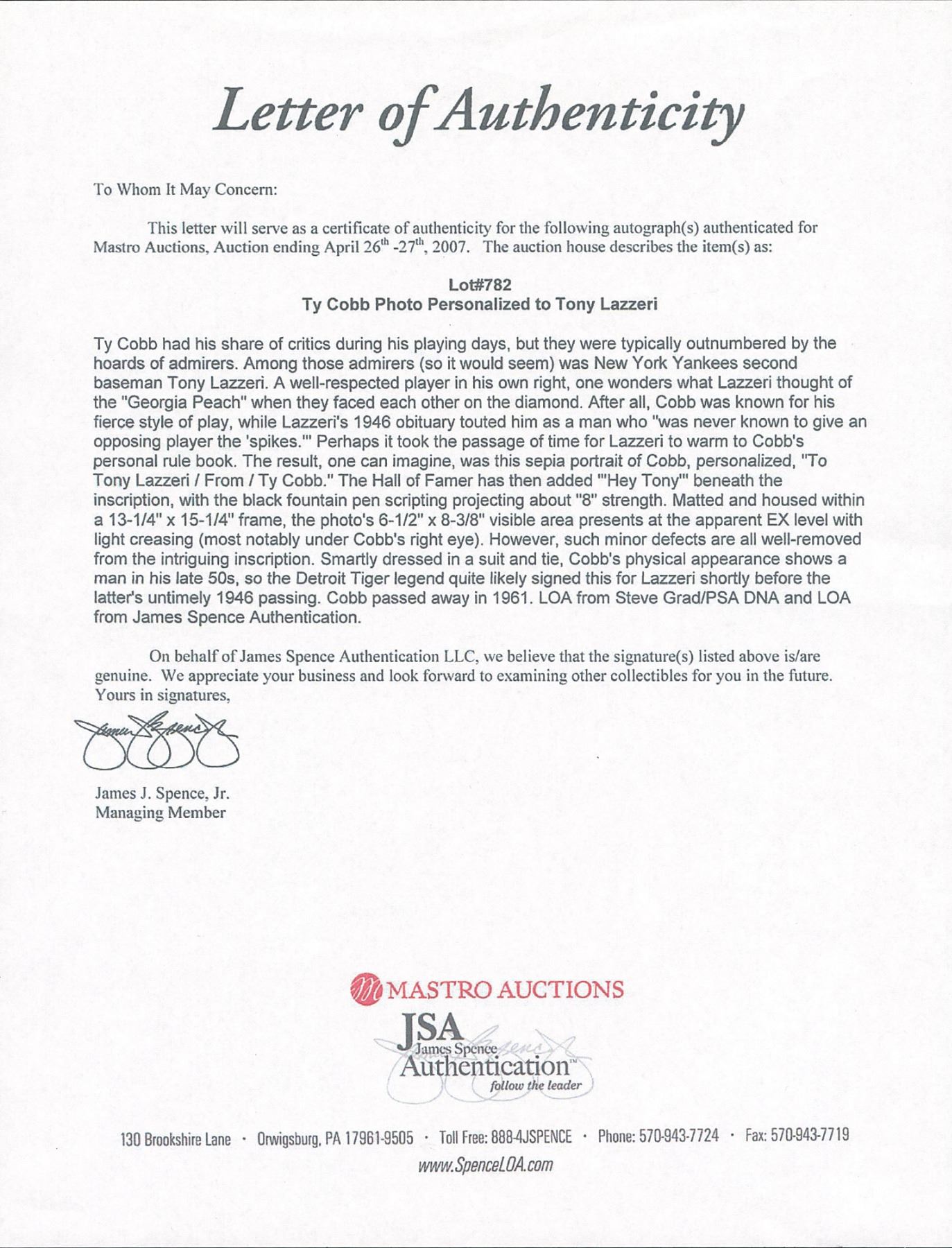 Unique glossy 6.5 x 8.25 close-up photo of Cobb in a suit and tie, signed and inscribed in fountain pen to the Yankee Hall of Famer, "To Tony Lazzeri, From Ty Cobb, 'Hey Tony.'" Matted to an overall size of 12 x 14. In fine condition, with light surface creases to Cobb's face. This fantastic presentation portrait represents a dichotomy between baseball legends—while Ty Cobb's legacy was that of a fierce base runner, Tony Lazzeri was remembered as a gentleman on the base paths, with his obituary memorializing him as a competitor 'never known to give an opposing player the 'spikes.'' A significant token of respect presented from one great ballplayer to another.