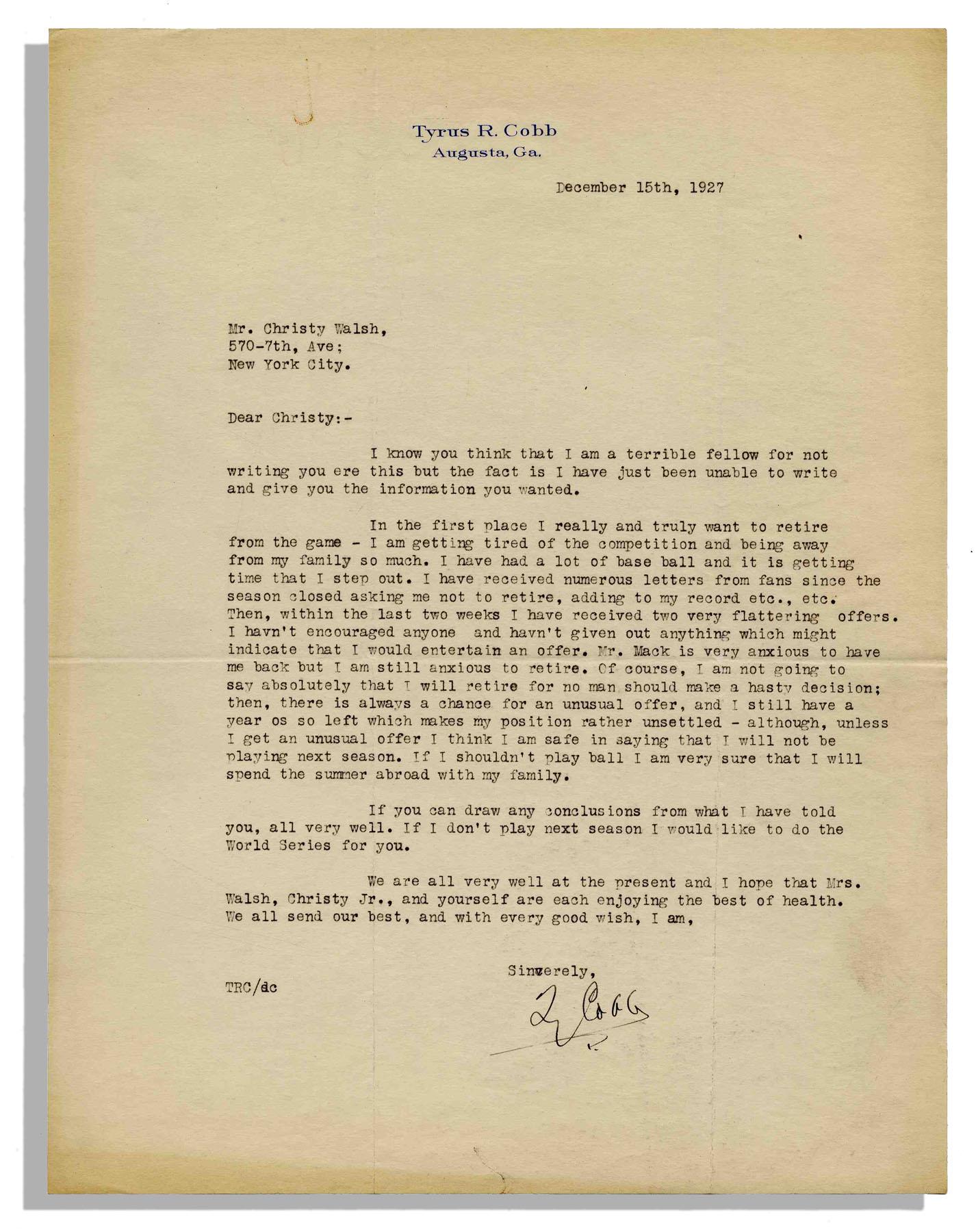 Ty Cobb typed letter signed, dated 15 December 1927, on ''Tyrus R. Cobb / August, Ga.'' letterhead. Letter, typed in black ink, is addressed to sports agent Christy Walsh and discusses Cobb's desire to retire. Reads in part, ''Dear Christy: -- I know you think that I am a terrible fellow for not writing you ere this but the fact is I have just been unable to write and give you the information you wanted. In the first place I really and truly want to retire from the game -- I am getting tired of the competition and being away from my family so much. I have had a lot of base ball and it is getting time that I step out. I have received numerous letters from fans since the season closed asking me not to retire, adding to my record etc., etc. Then, within the last two weeks I have received two very flattering offers. I haven't encouraged anyone and haven't given out anything which might indicate that I would entertain an offer. Mr. Mack is very anxious to have me back but I am still anxious to retire. Of course, I am not going to say absolutely that I will retire for no man should make a hasty decision; then there is always a chance for an unusual offer, and I still have a year or so left which makes my position rather unsettled -- although, unless I get an unusual offer I think I am safe in saying that I will not be playing next season. If I shouldn't play ball I am very sure that I will spend the summer abroad with my family. If you can draw any conclusions from what I have told you, all very well. If I don't play next season I would I would like to do the World Series for you…'' Signed clearly, ''Ty Cobb'' in black ink. Letter, measuring 8.5'' x 11'', has light folding throughout, else near fine. With PSA/DNA COA.