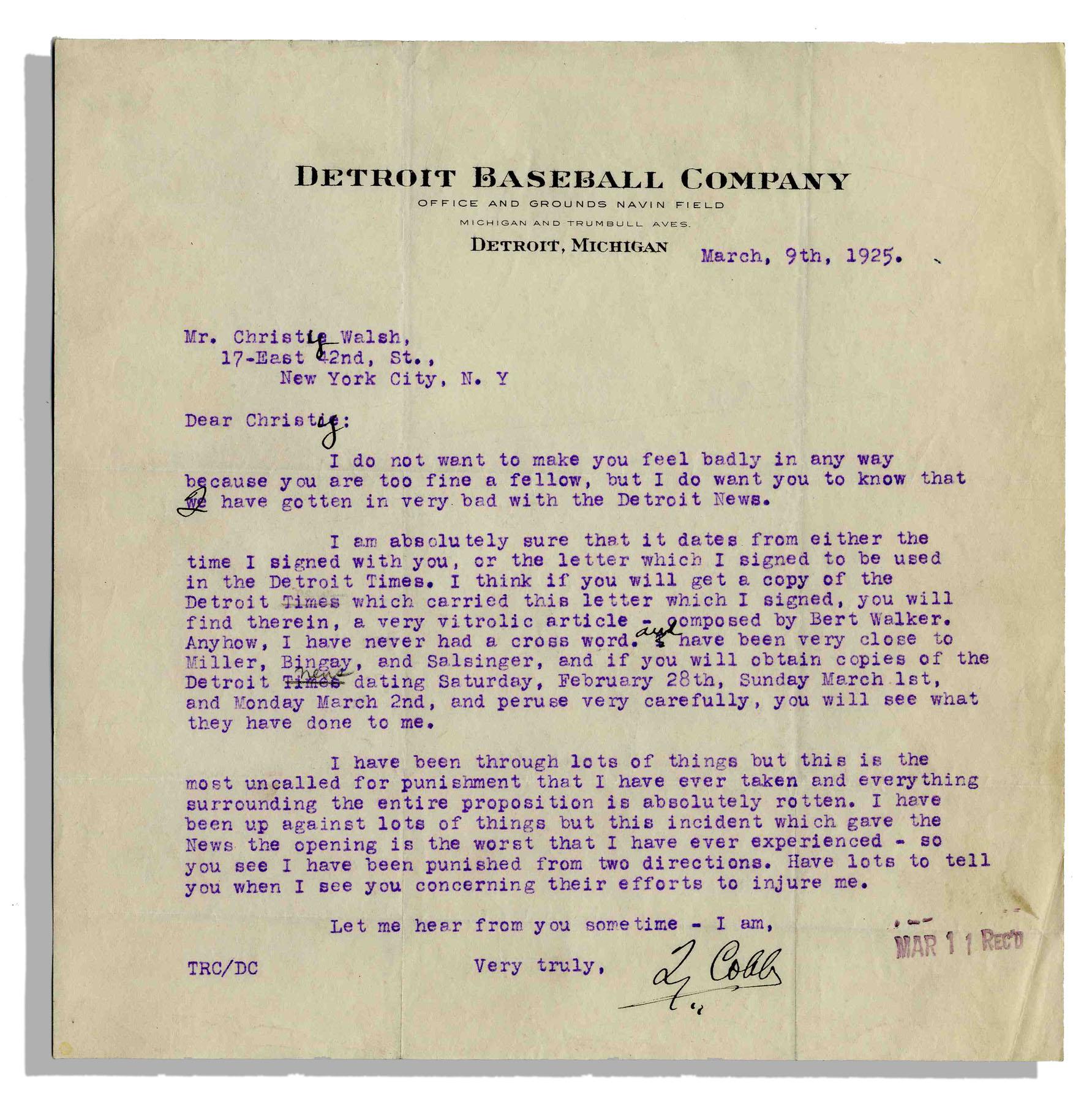 Ty Cobb typed letter signed, dated 9 March 1925, on ''Detroit Baseball Company'' letterhead, where Cobb was both a player and manager for the Detroit Tigers at the time. Letter, typed in purple ink with handwritten corrections by Cobb, is addressed to sports agent Christy Walsh and discusses Cobb's distress over a Detroit News article defaming him. Reads in full, ''Dear Christy: I do not want to make you feel badly in any way because you are too fine a fellow, but I do want you to know that we [I] have gotten in very bad with the Detroit News. I am absolutely sure that it dates from either the time I signed with you, or the letter which I signed to be used in the Detroit Times. I think if you will get a copy of the Detroit Times which carried this letter which I signed, you will find therein, a very vitrolic article - composed by Bert Walker. Anyhow, I have never had a cross word and have been very close to Miller, Bingey. and Salsinger, and if you will obtain copies of the Detroit news dating Saturday, February 28th, Sunday March 1st, and Monday March 2nd, and peruse very carefully, you will see what they have done to me. I have been through lots of things but this is the most uncalled for punishment that I have ever taken and everything surrounding the entire proposition is absolutely rotten. I have been up against lots of things but this incident which gave the News the opening is the worst that I have ever experienced -- so you see I have been punished from two directions. Have lots to tell you when I see you concerning their efforts to injure me. Let me hear from you sometime -- I am, Very Truly, Ty Cobb''. Letter, measuring 8.5'' x 8.5'', has folding throughout, else near fine condition. With PSA/DNA COA.