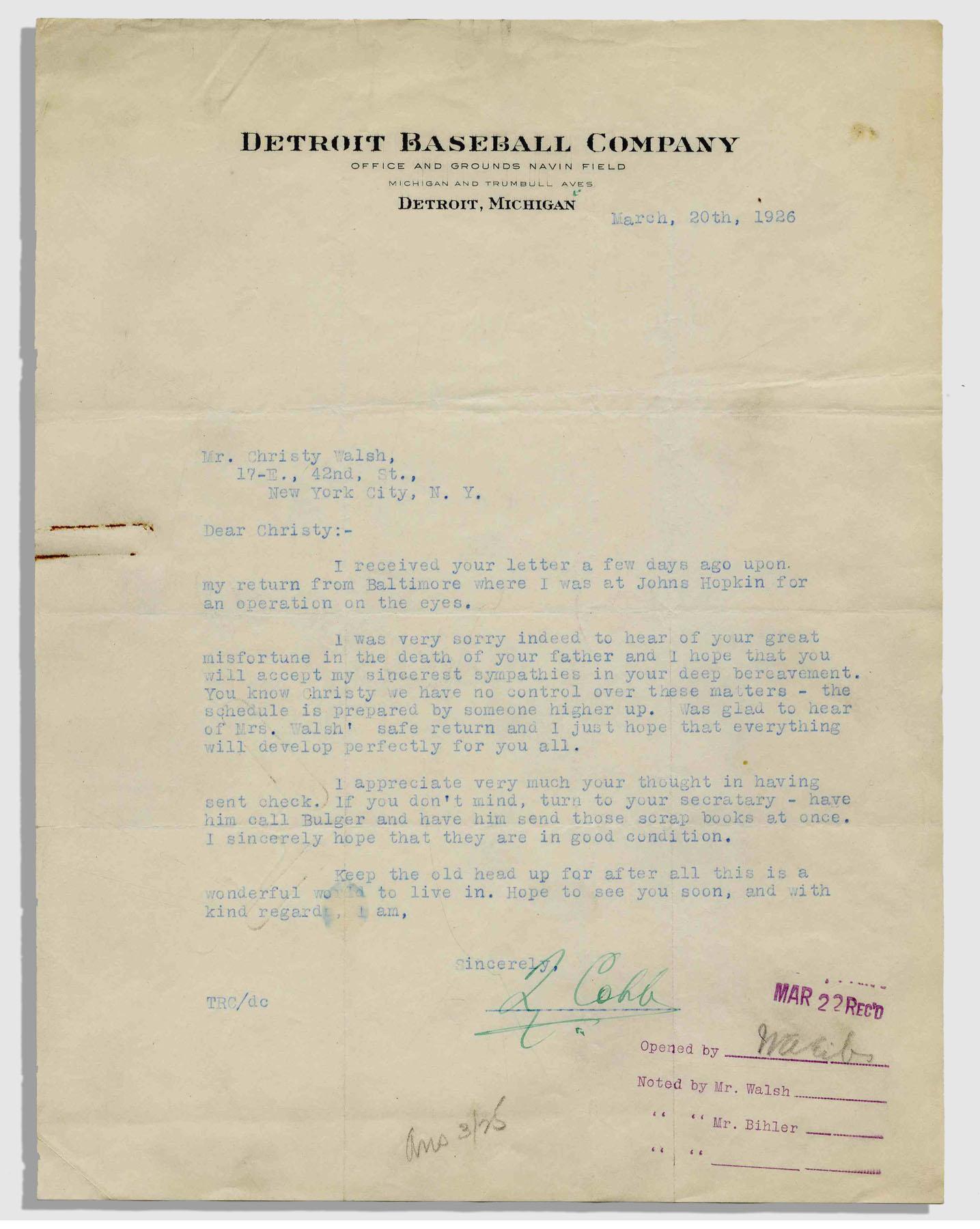 Ty Cobb typed letter signed, dated 20 March 1926, on ''Detroit Baseball Company'' letterhead, where Cobb was both a player and manager for the Detroit Tigers at the time. Letter, typed in blue ink, is addressed to Cobb's sports agent Christy Walsh and expresses his sympathies over the news of the death of Walsh's father. Reads in full: ''Dear Christy: -- I received your letter a few days ago upon my return from Baltimore where I was at Johns Hopkin [sic] for an operation on the eyes. I was very sorry indeed to hear of your great misfortune in the death of your father and I hope that you will accept my sincerest sympathies in your deep bereavement. You know Christy we have no control over these matters -- the schedule is prepared by someone higher up. Was glad to hear of Mrs. Walsh' safe return and I just hope that everything will develop perfectly for you all. I appreciate very much your thought in having sent check. If you don't mind, turn to your secretary -- have him call Bulger and have him send those scrap books at once. I sincerely hope they are in good condition. Keep the old head up for after all this is a wonderful world we live in. Hope to see you soon, and with kind regards, I am, Sincerely, Ty Cobb''. Signed boldly in green ink. Letter, measuring 8.5'' x 11'', has folds throughout and minor foxing in spots, including a rusted paperclip imprint. With a ''received by'' stamp in purple ink at lower right and an ''Ans 3/25'' pencil mark noting that Walsh answered the letter. With PSA/DNA COA. Very good condition.