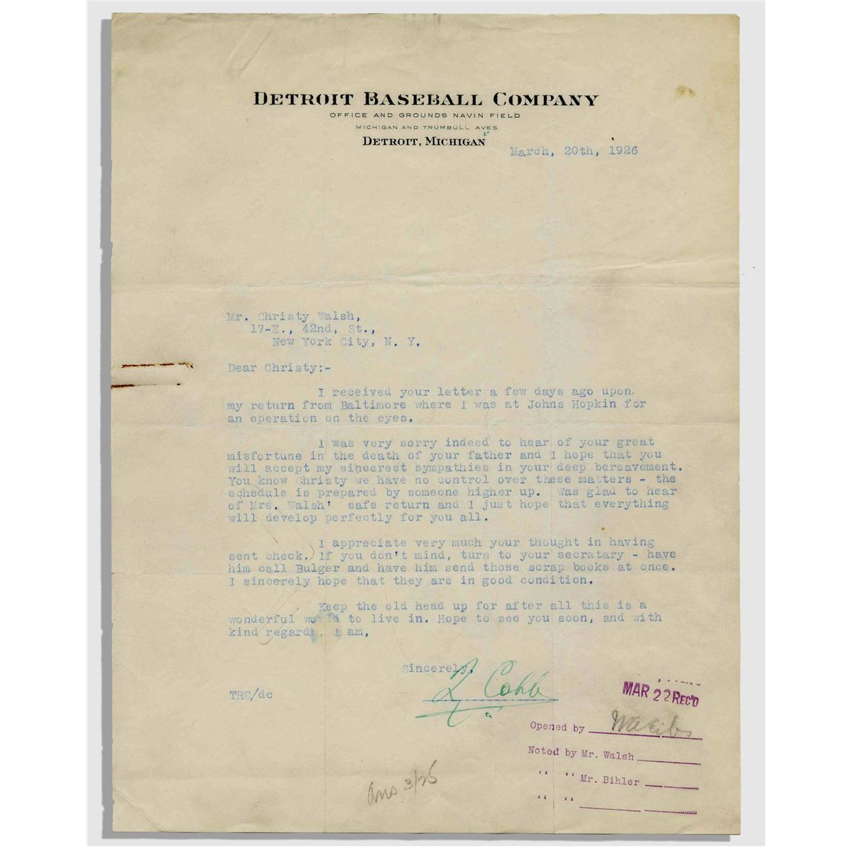 Ty Cobb typed letter signed, dated 20 March 1926, on ''Detroit Baseball Company'' letterhead, where Cobb was both a player and manager for the Detroit Tigers at the time. Letter, typed in blue ink, is addressed to Cobb's sports agent Christy Walsh and expresses his sympathies over the news of the death of Walsh's father. Reads in full: ''Dear Christy: -- I received your letter a few days ago upon my return from Baltimore where I was at Johns Hopkin [sic] for an operation on the eyes. I was very sorry indeed to hear of your great misfortune in the death of your father and I hope that you will accept my sincerest sympathies in your deep bereavement. You know Christy we have no control over these matters -- the schedule is prepared by someone higher up. Was glad to hear of Mrs. Walsh' safe return and I just hope that everything will develop perfectly for you all. I appreciate very much your thought in having sent check. If you don't mind, turn to your secretary -- have him call Bulger and have him send those scrap books at once. I sincerely hope they are in good condition. Keep the old head up for after all this is a wonderful world we live in. Hope to see you soon, and with kind regards, I am, Sincerely, Ty Cobb''. Signed boldly in green ink. Letter, measuring 8.5'' x 11'', has folds throughout and minor foxing in spots, including a rusted paperclip imprint. With a ''received by'' stamp in purple ink at lower right and an ''Ans 3/25'' pencil mark noting that Walsh answered the letter. With PSA/DNA COA. Very good condition.