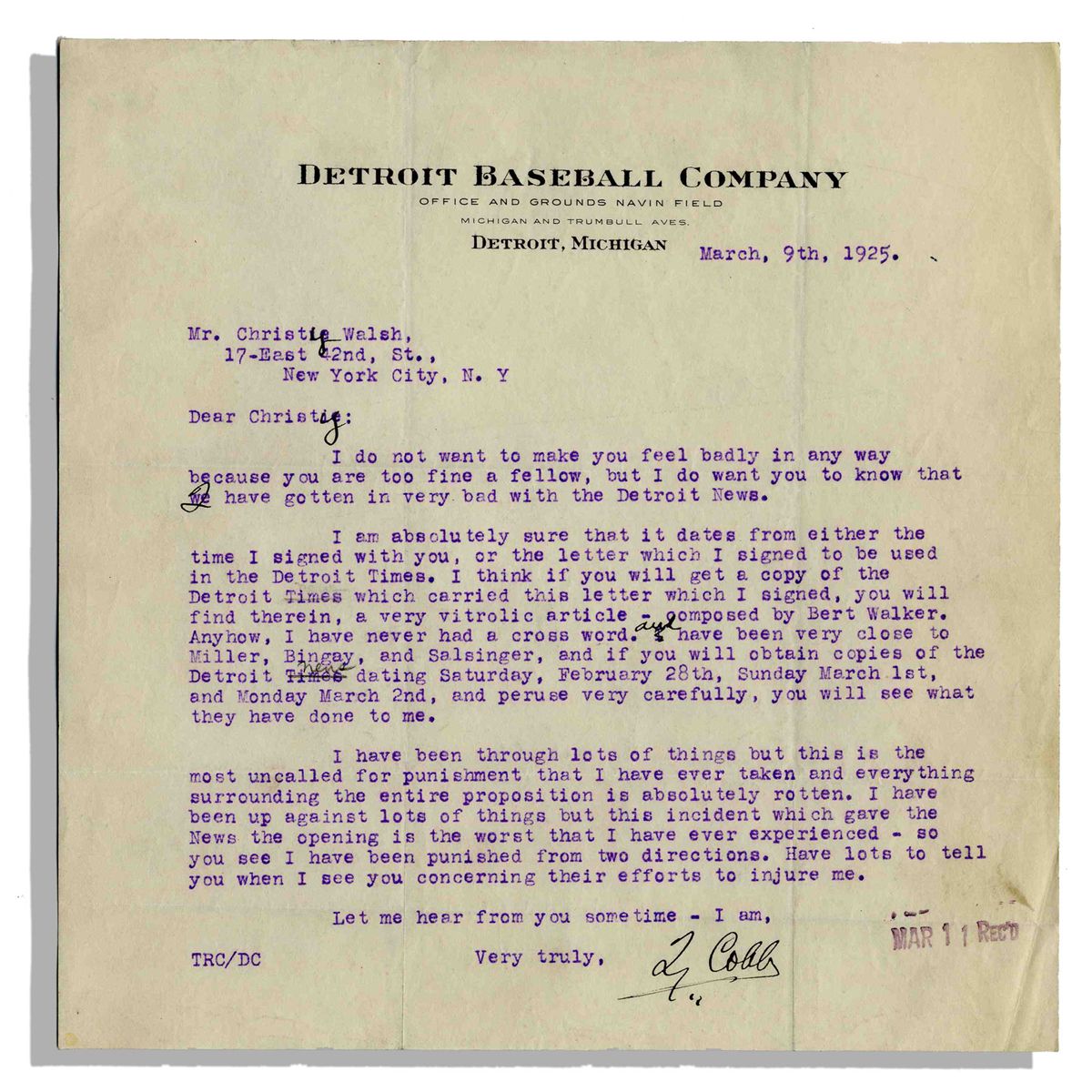 Ty Cobb typed letter signed, dated 9 March 1925, on ''Detroit Baseball Company'' letterhead, where Cobb was both a player and manager for the Detroit Tigers at the time. Letter, typed in purple ink with handwritten corrections by Cobb, is addressed to sports agent Christy Walsh and discusses Cobb's distress over a Detroit News article defaming him. Reads in full, ''Dear Christy: I do not want to make you feel badly in any way because you are too fine a fellow, but I do want you to know that I have gotten in very bad with the Detroit News. I am absolutely sure that it dates from either the time I signed with you, or the letter which I signed to be used in the Detroit Times. I think if you will get a copy of the Detroit Times which carried this letter which I signed, you will find therein, a very vitrolic article - composed by Bert Walker. Anyhow, I have never had a cross word and have been very close to Miller, Bingey and Salsinger, and if you will obtain copies of the Detroit news dating Saturday, February 28th, Sunday March 1st, and Monday March 2nd, and peruse very carefully, you will see what they have done to me. I have been through lots of things but this is the most uncalled for punishment that I have ever taken and everything surrounding the entire proposition is absolutely rotten. I have been up against lots of things but this incident which gave the News the opening is the worst that I have ever experienced -- so you see I have been punished from two directions. Have lots to tell you when I see you concerning their efforts to injure me. Let me hear from you sometime -- I am, Very Truly, Ty Cobb''. Letter, measuring 8.5'' x 8.5'', has folding throughout, else near fine condition. With PSA/DNA COA.