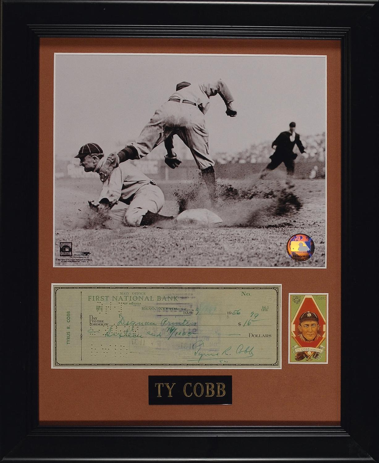 Personal check, 8 x 3, filled out and signed by Cobb, “Tyrus R. Cobb,” payable to Digman Printers for $16.79, July 19, 1956. Matted and framed, with a photo of Cobb sliding hard into third and a small name plaque and card, to an overall size of 13.5 x 15.5. Cancellation holes to left side, and show-through from stamps on reverse, lightly affecting signature, otherwise fine condition.