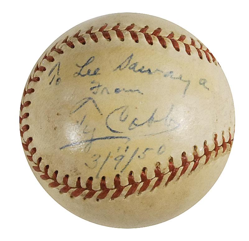 Rare official Spalding mini baseball signed and inscribed in blue ballpoint on a side panel, “To Lee Sawarya from Ty Cobb 3/9/50.” In very good condition, with a thin layer of shellac applied over signature and inscription, some scattered light toning and soiling, and a few light areas of scuffing. First such Cobb signed mini ball we have seen.