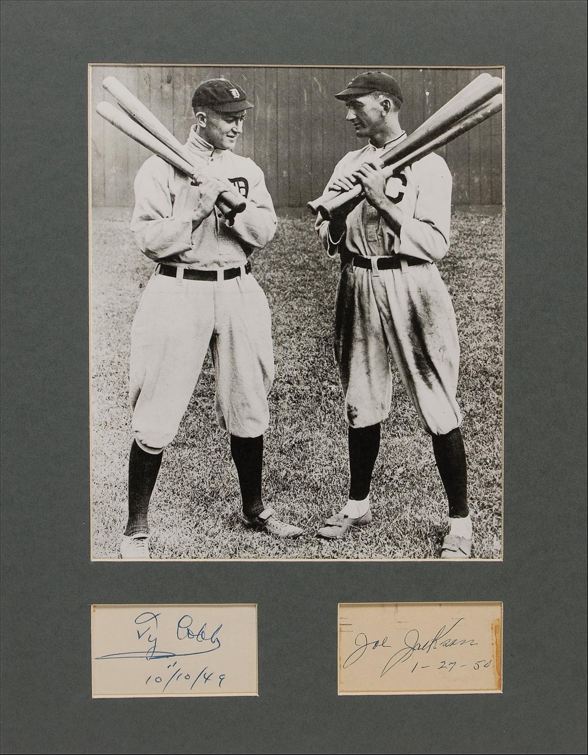 Vintage ballpoint signature, “Ty Cobb, 10/10/49,” on an off-white 3 x 1.75 slip. Matted with a Joe Jackson autograph signed by Jackson’s wife and a photo of the two players to an overall size of 11 x 14. In fine condition, with a bit of edge toning to Cobb’s slip.