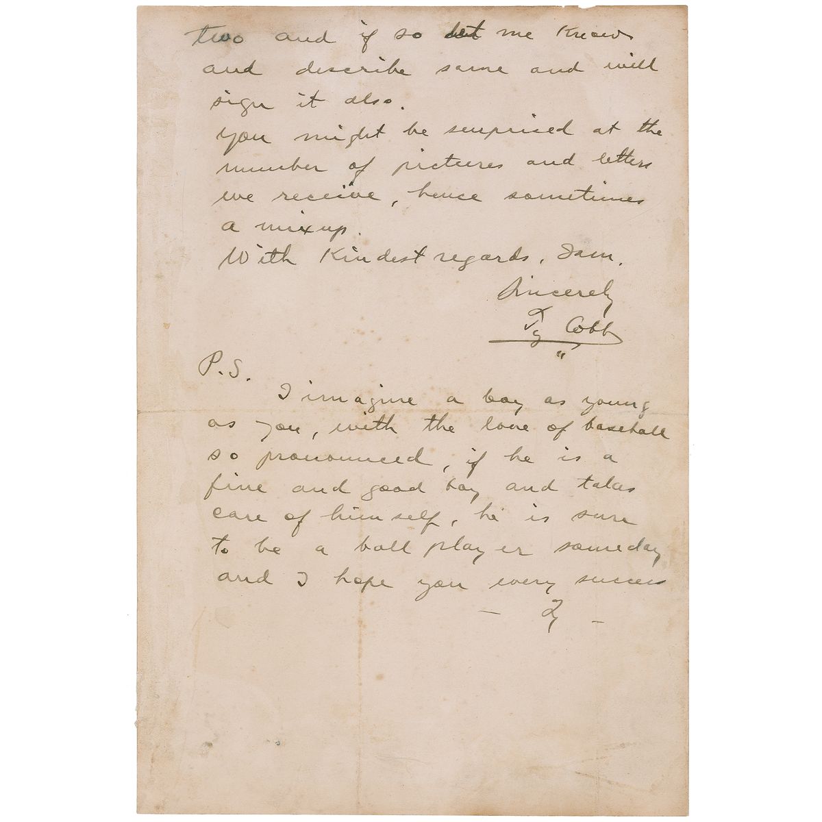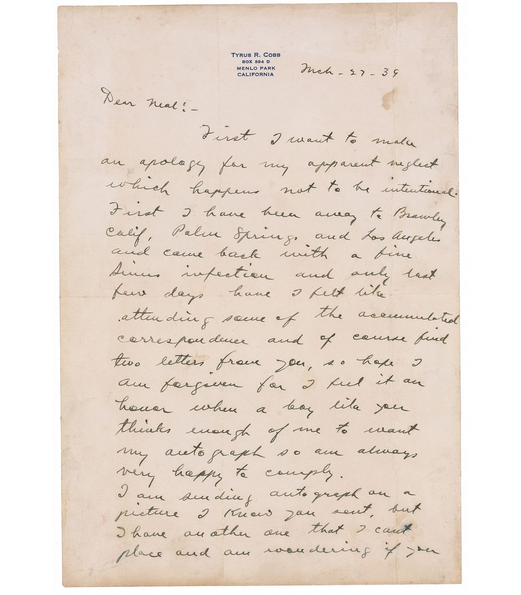 ALS twice signed, “Ty Cobb,” and “Ty,” two pages, 7.25 x 10.5, personal letterhead, March 27, 1939. Cobb writes from Menlo Park, California, to “Neal,” in part: “First I want to make an apology for my apparent neglect which happens not to be intentional. First I have been away to Brawley Calif, Palm Springs and Los Angeles and came back with a fine Sinus infection and only last few days have I felt like attending some of the accumulated correspondence and of course find two letters from you, so hope I am forgiven for I feel it an honor when a boy like you thinks enough of me to want my autograph so am always very happy to comply. I am sending autograph on a picture I know you sent, but I have another one that I can't place and am wondering if you [have] two and if so let me know and describe same and will sign it also. You might be surprised at the number of pictures and letters we receive, hence sometimes a mixup," adding the post script, "I imagine a boy as young as you, with the love of baseball so pronounced, if he is a fine and good boy and takes care of himself, he is sure to be a ball player someday and I hope you every success.” In very good condition, with intersecting folds, one passing through a single letter of the first signature, scattered toning and foxing, and mounting remnants on the reverse of both pages.