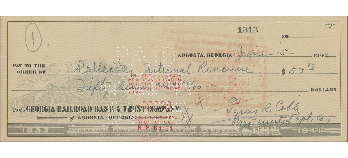Bank check, 8.25 x 3, filled out in another hand and signed by Cobb, “Tyrus R. Cobb, Pres. United Apt. Co.,” payable to Collector Internal Revenue for $57.44, June 15, 1944. In very good condition, with vertical fold to left side, expected cancellation holes, a small pencil notation, and show-through from stamps on reverse lightly affecting portion of signature.
