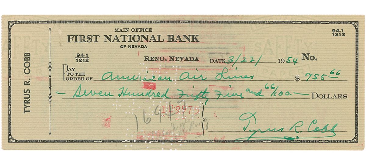 Personal check, 8.25 x 3, filled out and signed by Cobb, “Tyrus R. Cobb,” payable to American Air Lines for $755.66, March 22, 1954. In fine condition, with cancelation holes to body, light show-through from stamps on reverse, and a couple pencil notations. The signature area is clean and unaffected. Accompanied by an unsigned glossy 8 x 10 photo of Cobb on the field.