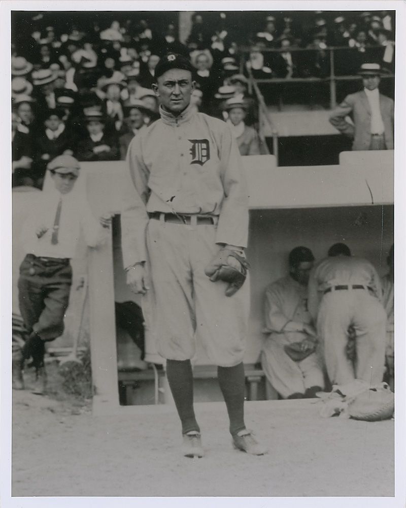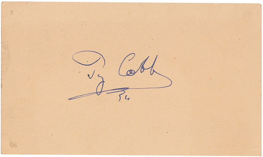 Vintage fountain pen signature, “Ty Cobb,” on an off-white 5.5 x 3.25 government postcard. In fine condition, with scattered mild creasing not affecting signature. Accompanied by an unsigned satin-finish 8 x 10 photo of Cobb in front of the dugout.