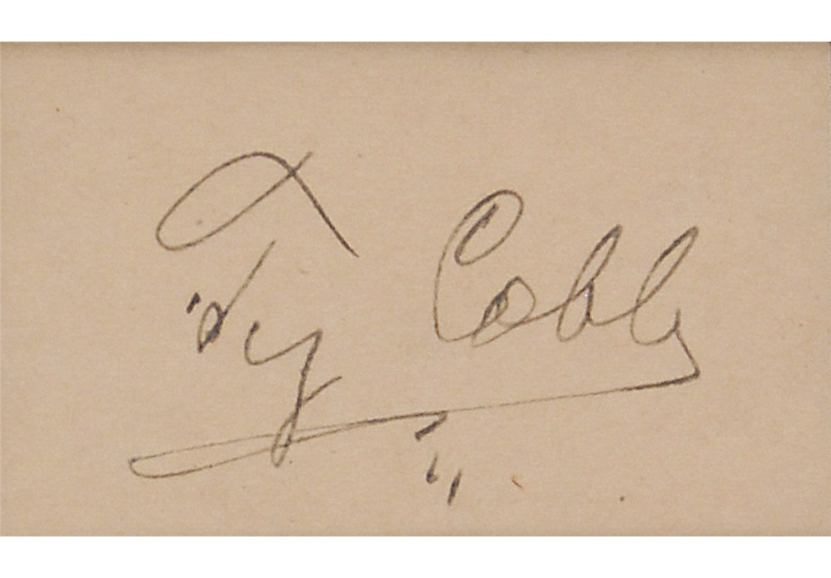 Vintage ink signature, “Ty Cobb,” on an off-white slip. Matted and framed with a photo of Cobb swinging his bat to an overall size of 12.25 x 14.5. In fine condition.