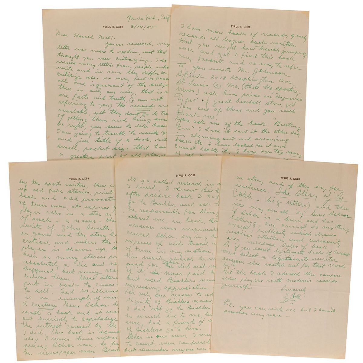 ALS, five pages, 7.25 x 10.5, personal letterhead, March 14, 1955. Letter to Harold L. O’Neal. In part (with grammar retained): “You seem to like baseball I am going to…give title of a book, rather small, pocket size that have a greater part of all player