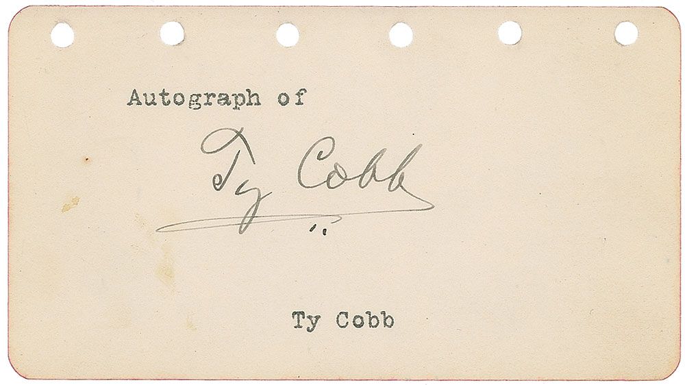 Highly desirable vintage fountain pen signature, “Ty Cobb,” on an off-white 4.5 x 2.5 page. In fine condition, with a bit of soiling to the lower left.