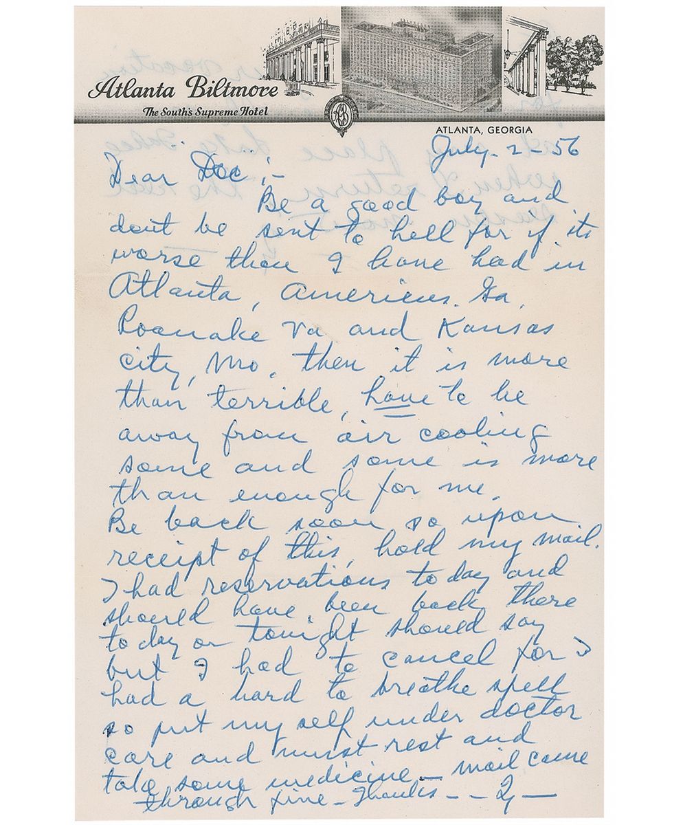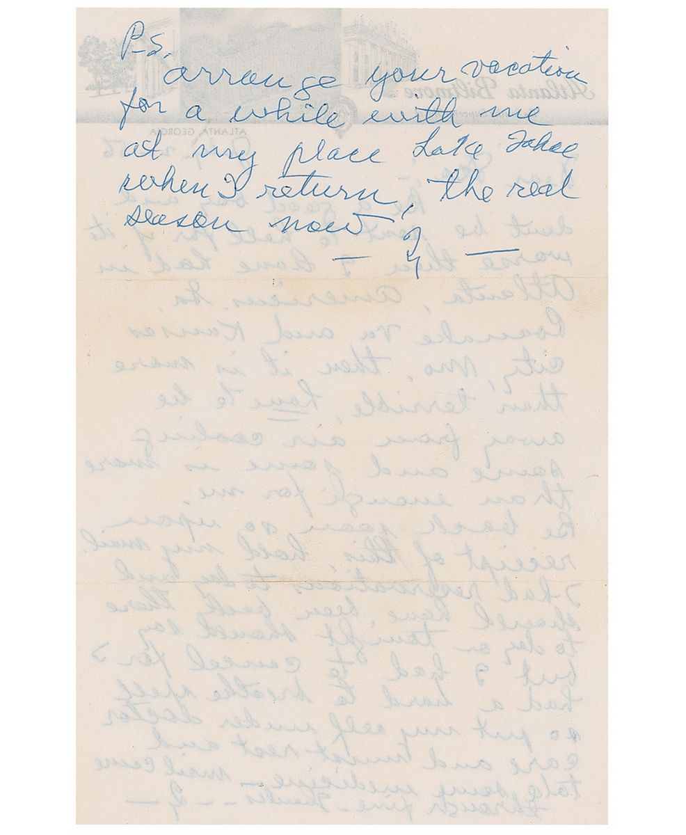 ALS signed “Ty,” one page both sides, 5.5 x 8.25, Atlanta Biltmore letterhead, July 2, 1956. Letter to ‘Doc’ Morris. In part: “Be a good boy and don’t be sent to hell for if it’s worse than I have had in Atlanta, Americus, Ga., Roanoke, Va., and Kansas City, Mo., then it is more than terrible, have to be away from air cooling some and some is more than enough for me.” In a postscript on the reverse, also signed “Ty,” Cobb invites Mr. Morris to his vacation home on Lake Tahoe. In fine condition. Accompanied by the original mailing envelope, addressed in Cobb’s hand. Accompanied by a full letter of authenticity and grading from PSA/DNA, grading the autograph a “9.”