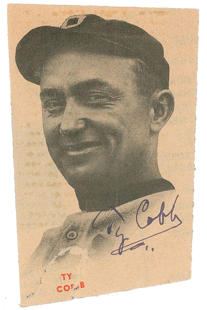 Vintage 2.25 x 3.25 clipped program photo of Cobb in his uniform, signed in fountain pen. In fine condition, with a repaired tear to bottom edge, not affecting signature, and uneven edges.