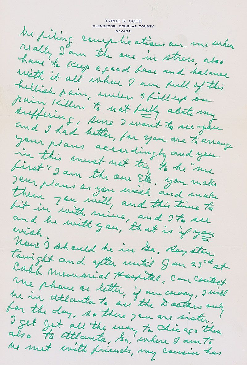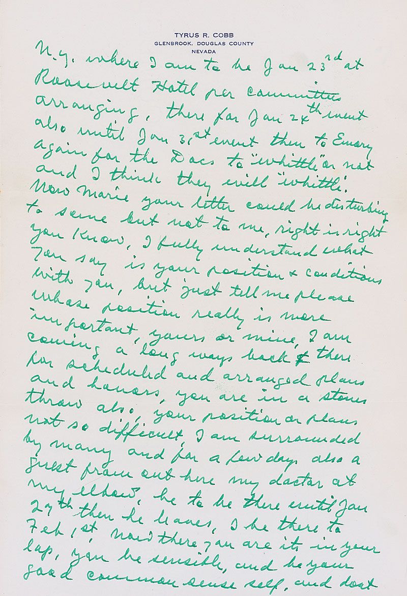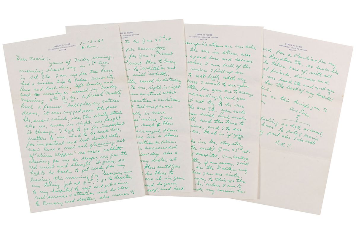 Lengthy ALS signed “T. R. C.,” four pages, 7.25 x 10.5, personal letterhead, November 13, 1960. Letter to Marie. In part: “Had a vicious trip to Tahoe, Carson City, Reno and back here…a friend ‘Muddy’ Ruel a former ballplayer, catcher drove, it was rugged over the pass the snow, wind, ice, etc.had to be back here, for important and last dental date, now have a new and gleaming set of ‘China clippers’ no more rabbit chewing for me or soups…I go to Royston to my hospital to rest and get some real services & attention and be close to Emory and doctors…I am full of this hellish pain, unless I fill up on pain killers to not fully abate my suffering…Now I should be in Ga. Royston tonight and after until Jan 23rd at Cobb Memorial Hospital, can contact me by phone or letter.” In fine condition. A fantastic letter with interesting content.