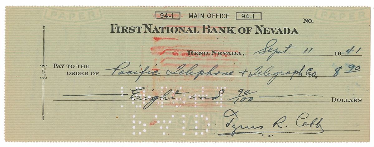 First National Bank of Nevada check, 8.25 x 3, filled out in another hand and signed by Cobb, “Tyrus R. Cobb,” payable to Pacific Telephone & Telegraph, Co. for $8.90, September 11, 1941. In fine condition, with a vertical fold, and expected bank stamps and cancellation holes.