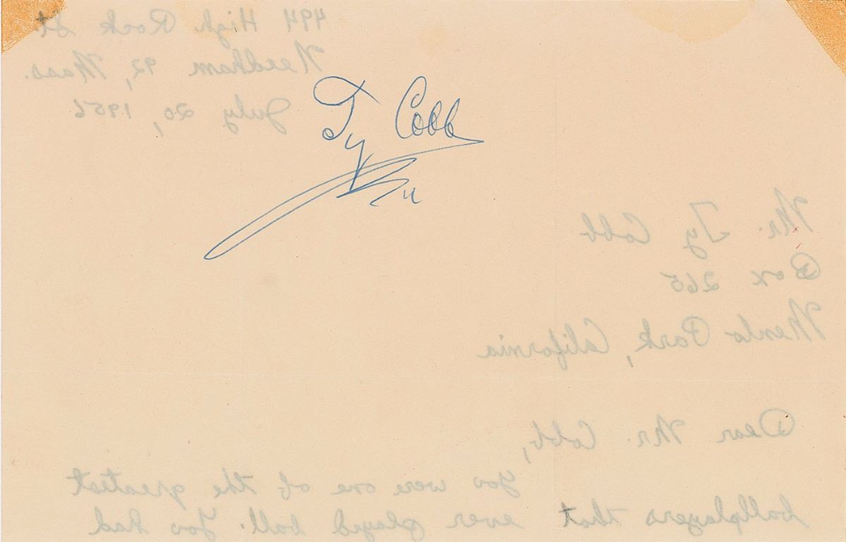 Ballpoint signature, “Ty Cobb,” on the reverse of an off-white 8.5 x 5.5 slip removed from an autograph request letter. Intersecting folds (one vertical fold passing through a portion of the paraph), slight show-through from writing to reverse, some irregular toning, and toned adhesive remnants to upper corners, otherwise fine condition.