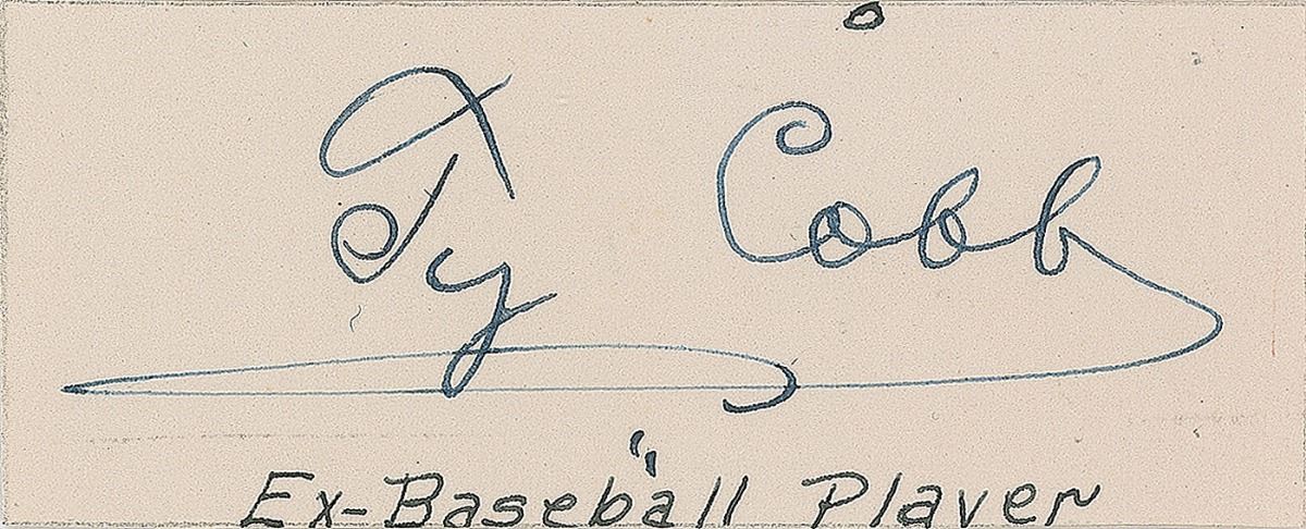 Bold fountain pen signature, “Ty Cobb,” on an off-white 2.75 x 1 card removed from a Waterman’s autograph book. In fine condition.