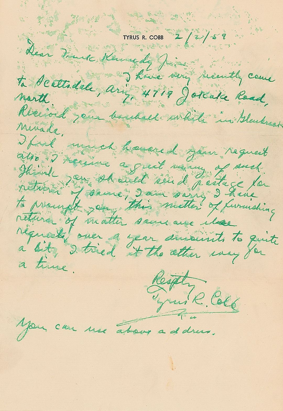 ALS signed “Tyrus R. Cobb,” one page, 7.25 x 10.5, personal letterhead, February 2, 1959. Letter to Frank Kennedy, Jr., in full: "I have very recently came to Scottsdale, Ariz., 4719 Jokake Road, North. Received your baseball while in Glenbrook, Nevada. I feel much honored [by] your request also I receive a great many of such. Think you should send postage for return of same; I am sorry I have to prompt you, this matter of furnishing return of matter someone else requests over a year amounts to quite a bit, I tried it the other way for a time." Cobb adds at the conclusion: "You can use above address." In very good condition, with overall creasing, and running to the ink, evidently from onetime exposure to moisture.