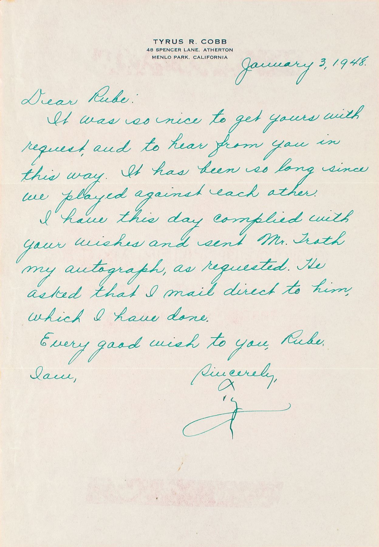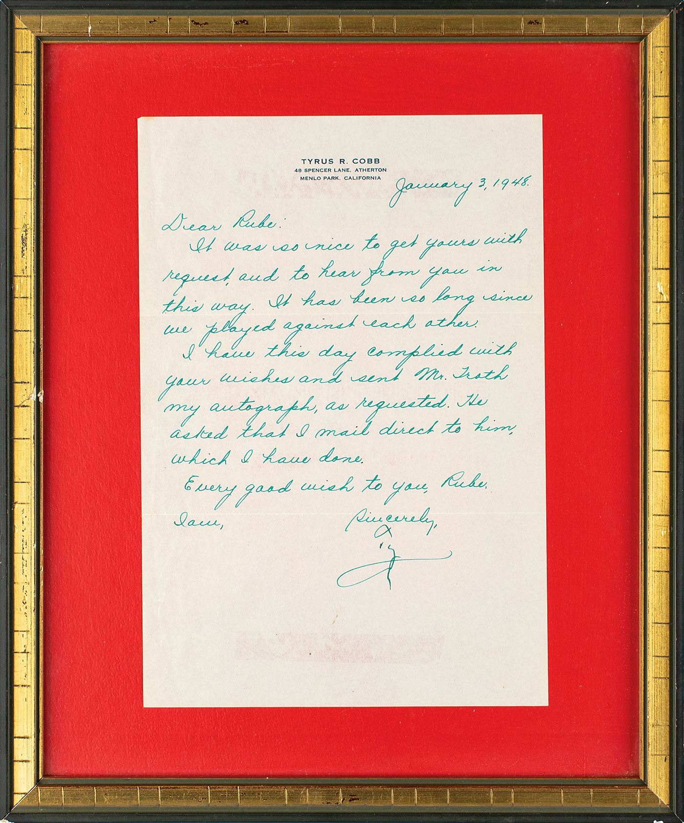 ALS signed “Ty,” one page, 7.25 x 10.5, personal letterhead, January 3, 1948. Letter to former professional ballplayer Rube Oldring, in full: "It was so nice to get yours with request, and to hear from you in this way. It has been so long since we played against each other. I have this day complied with your wishes and sent Mr. Troth my autograph, as requested. He asked that I mail direct to him, which I have done. Every good wish to you, Rube." Mounted and framed to an overall size of 12 x 14.5. In fine condition, with light show-through at the top and bottom from tape on the reverse, apparently used to affix the letter to the mat. Accompanied by the original mailing envelope addressed in Cobb's hand.