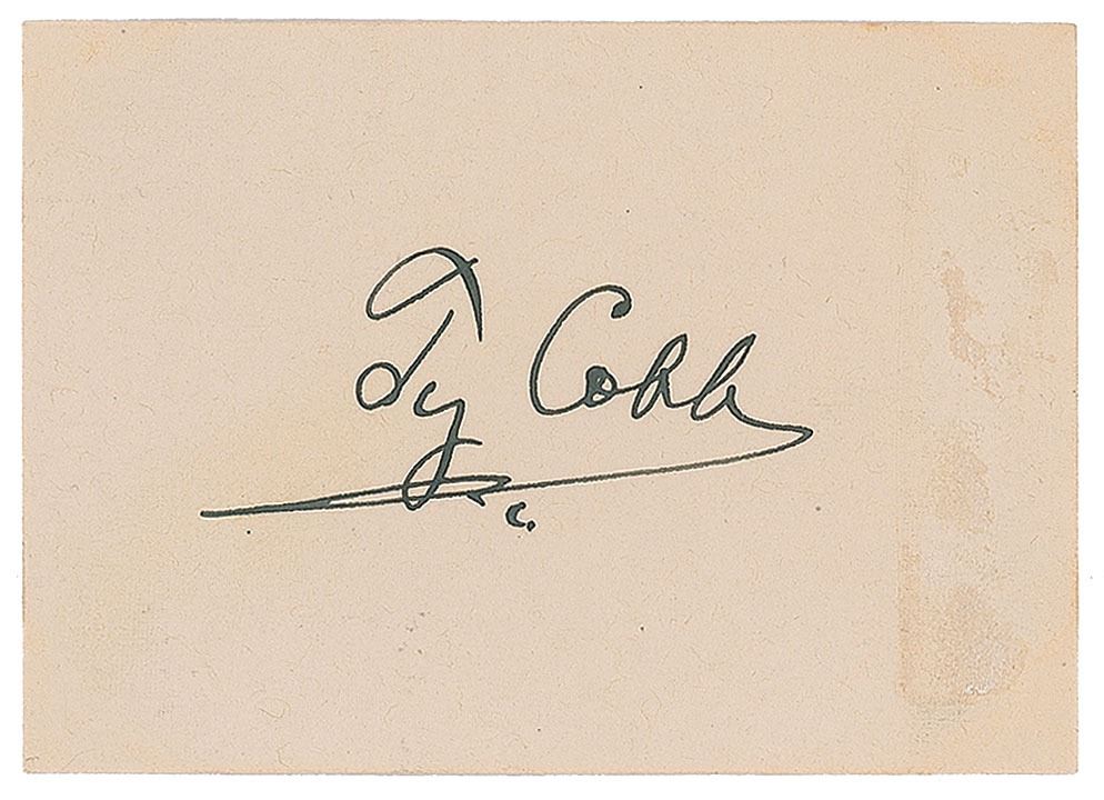 Bold and crisp vintage fountain pen signature, "Ty Cobb," on an off-white 3.5 x 2.5 card. In fine condition, with some light adhesive residue to the right edge, easily matted out.