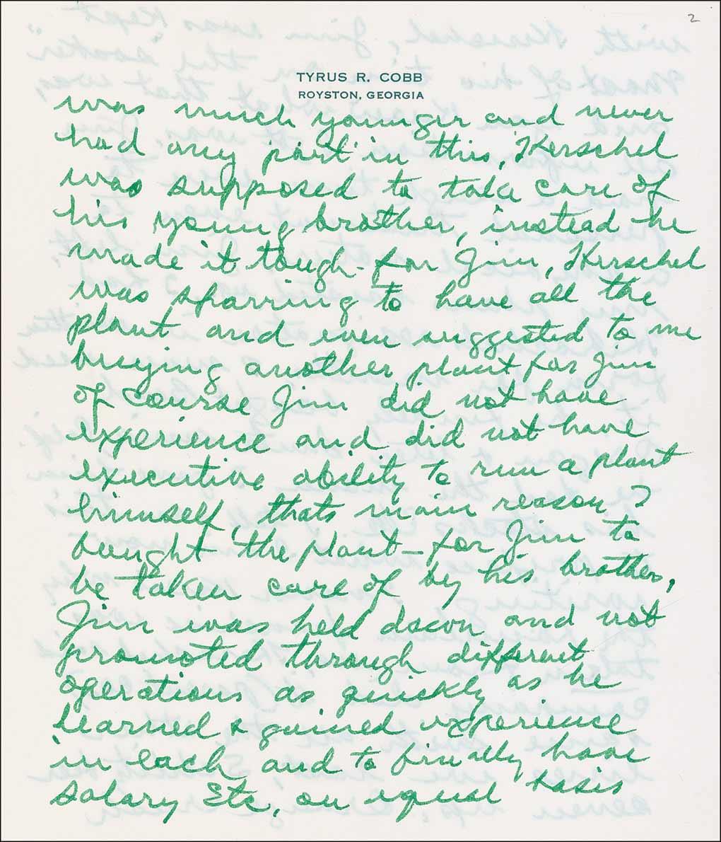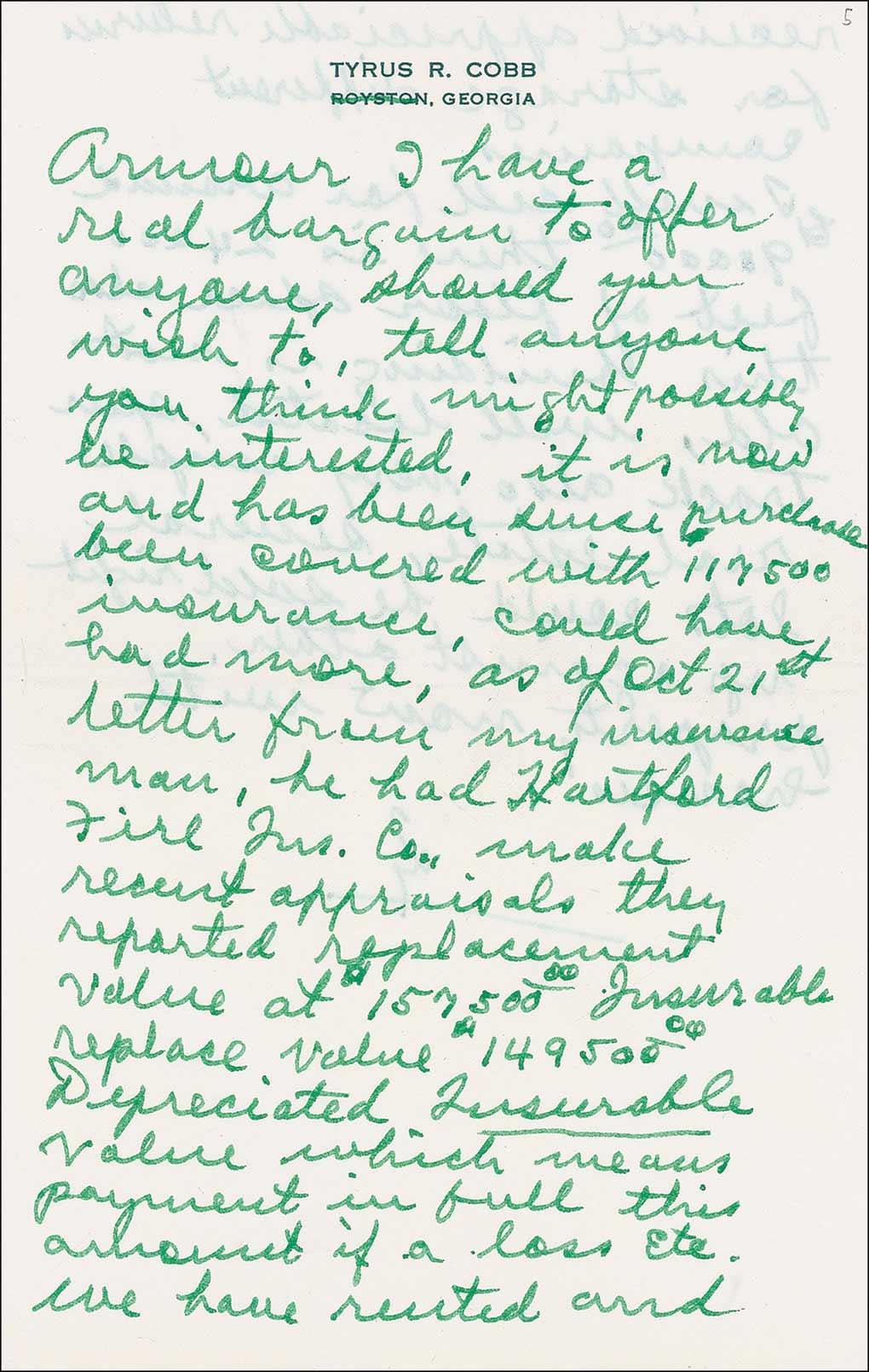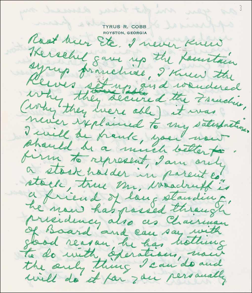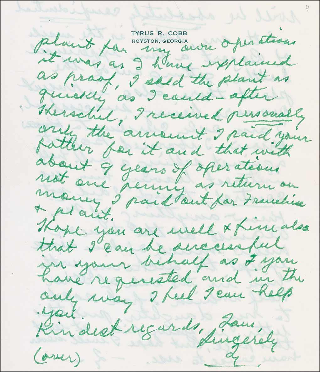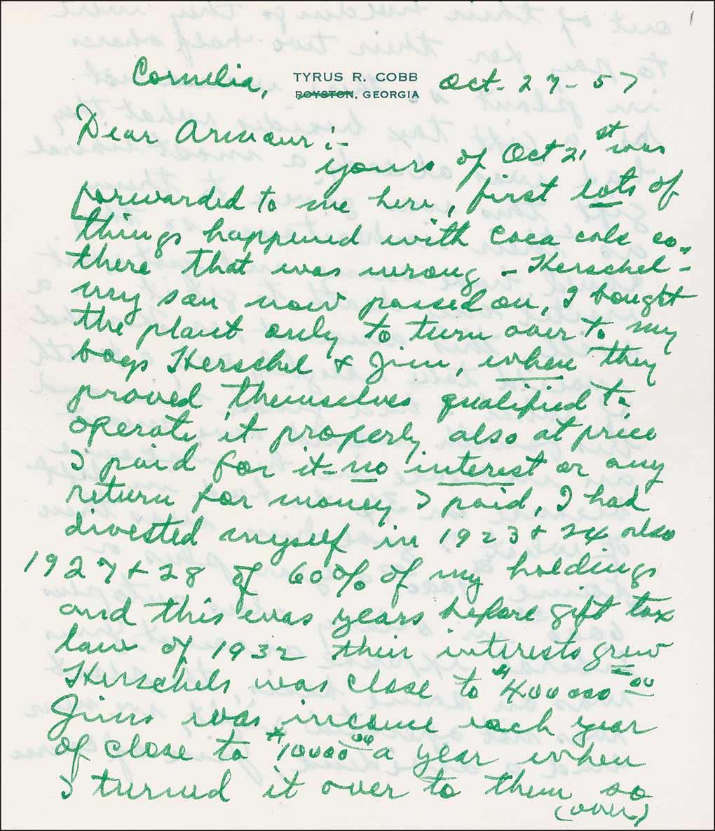 ALS signed three times “Ty,” five pages both sides, 6 x 7 (last page measuring 4.5 x 7), personal letterhead, October 27, 1957. A lengthy letter to Armour Anderson, the son of the man who sold him the Twin Falls, Idaho, Coca-Cola bottling plant. In part, with Cobb’s spelling and punctuation retained: