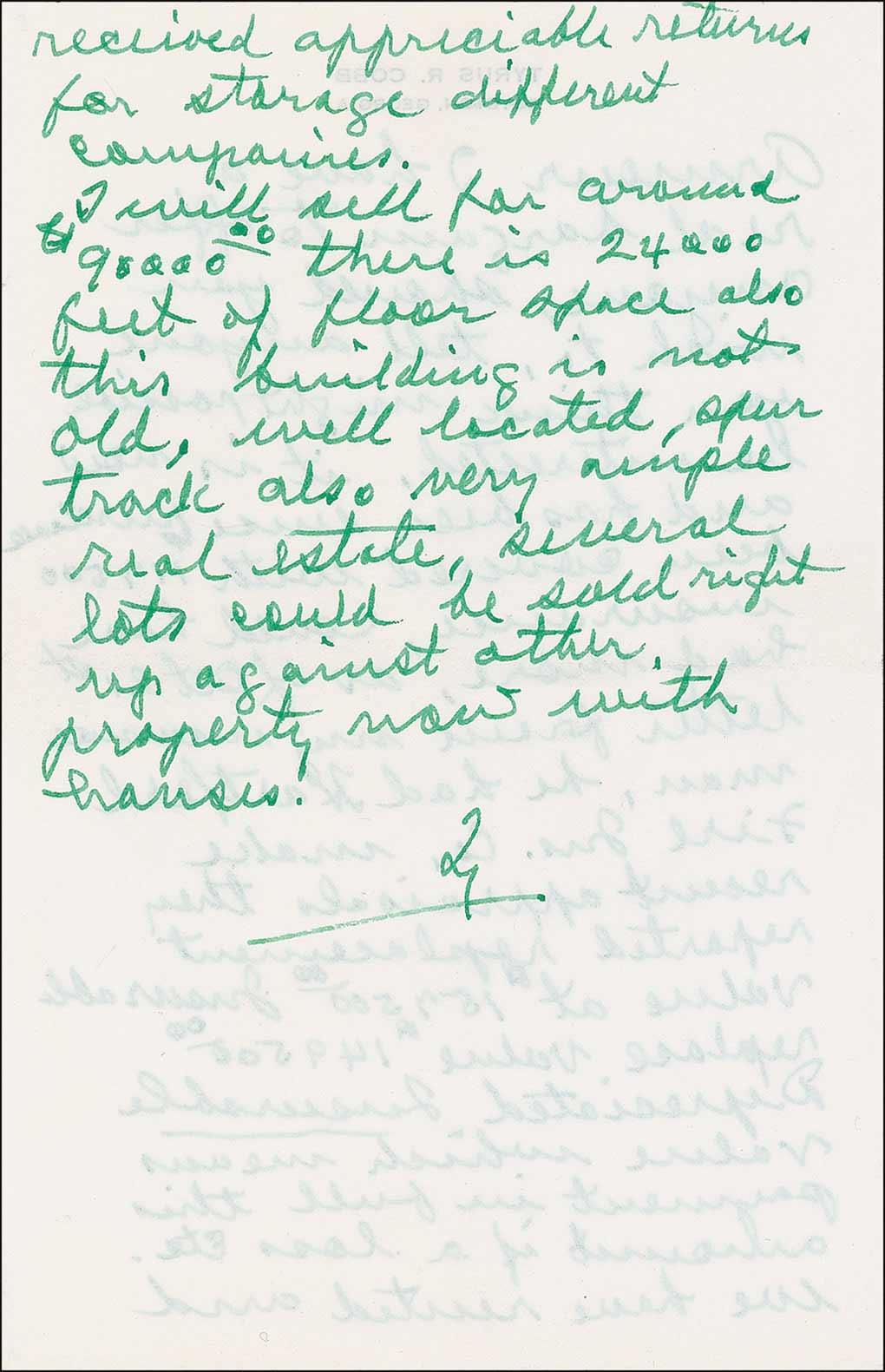 “Armour I have a real bargain to offer anyone, should you wish to, tell anyone you think might possibly be interested, it is now and has been since purchase been covered with $117500 insurance…Hartford Fire Ins. Co.…reported replacement value at $157500.00 Insurable replace value $149,500.00 Depreciated Insurable value which means payment in full this amount if a loss Etc. we have rented and received appreciable returns for storage different companies. I will sell for around $90000.00 there is 24000 feet of floor space also this building is not old, well located, spur track, also very ample real estate, several lots could be sold right up against other property now with houses.”