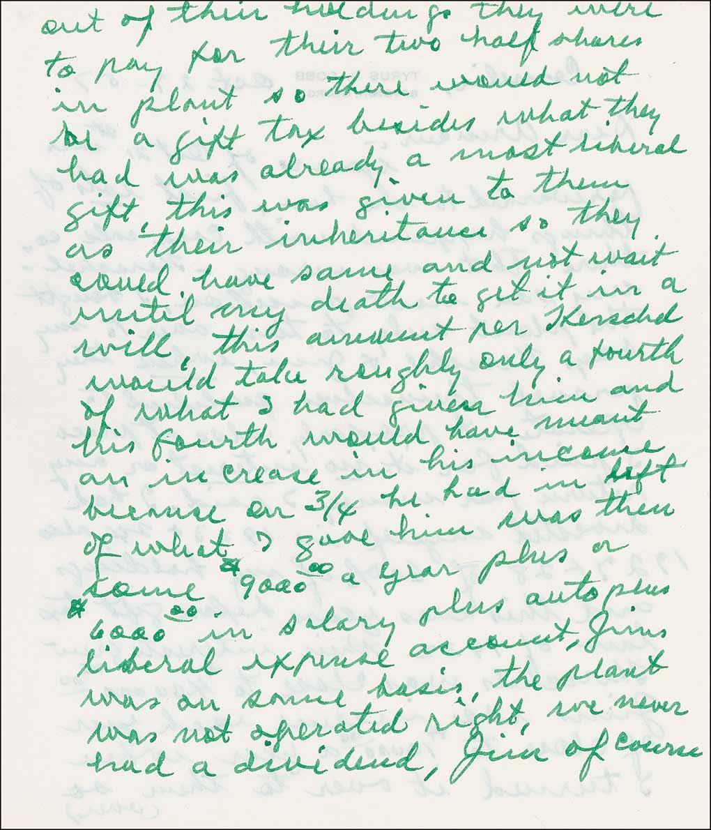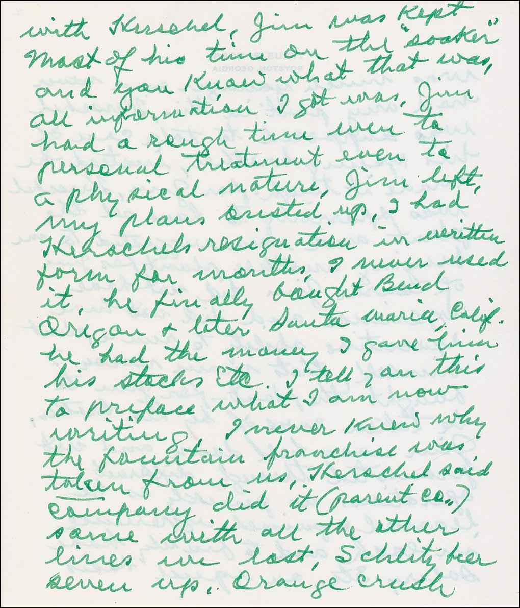 “Lots of things happened with Coca Cola Co. there that was wrong – Herschel – my son now passed on, I bought the plant only to turn over to my boys Herschel & Jim, when they proved themselves qualified to operate it properly also at price I paid for it – no interest or any return for money I paid…the plant was not operated right, we never had a dividend, Jim of course was much younger and never had any part in this. Herschel was supposed to take care of his younger brother, instead he made it tough for Jim, Herschel was sparring to have all the plant and even suggested to me buying another plant for Jim of course Jim did not have experience and did not have executive ability to run a plant himself, thats main reason I bought the plant – for Jim to be taken care of by his brother…