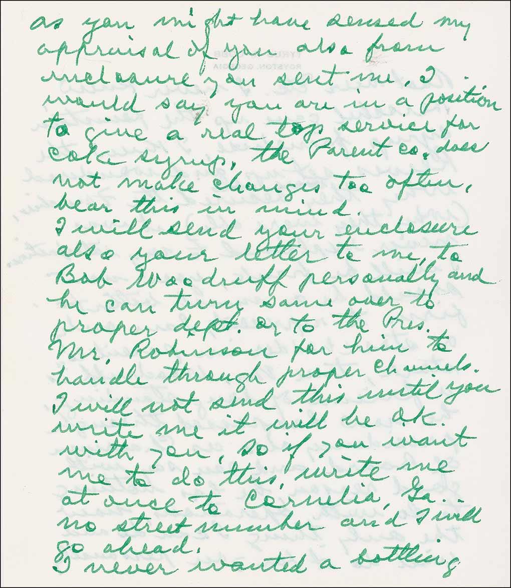 Already one of the National Pastime’s highest paid players, Cobb not only invested in the product and lent his face to advertising campaigns, but also, as referenced here, purchased three bottling plants in California, Idaho, and Oregon. The Georgia Peach went on to own 20,000 shares of company stock, which at the time of his death in 1961 was worth millions of dollars. Although investments in Coca-Cola made the Hall of Famer incredibly wealthy, this lengthy letter carries with it a more poignant tone, considering references to his son Herschel, who died in 1951, and youngest son, Jim. Cobb’s oldest son, Ty, Jr., had been estranged from his father prior to his 1952 death. A lengthy and detailed piece of correspondence from not only one of the most proficient ballplayers of all time, but one of its fiercest businessmen as well.