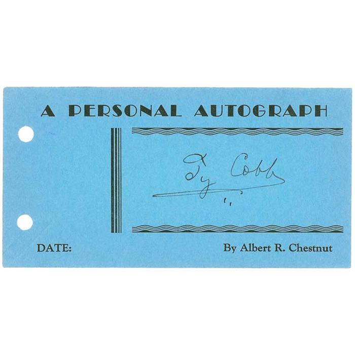 Vintage fountain pen signature, “Ty Cobb,” on a 5.5 x 2.75 blue card from the Albert R. Chestnut collection. Light paperclip impression to lower left corner, otherwise fine condition. From his Pennsylvania home, Chestnut, a printer by profession, began collecting autographs in 1935. He sent these personally-printed cards to over a thousand celebrities and received favorable replies from the vast majority, finally retiring from collecting to raise his family when postage increased from 2¢ per card! Pre-certified Steve Grad/PSA/DNA and RRAuction COA.