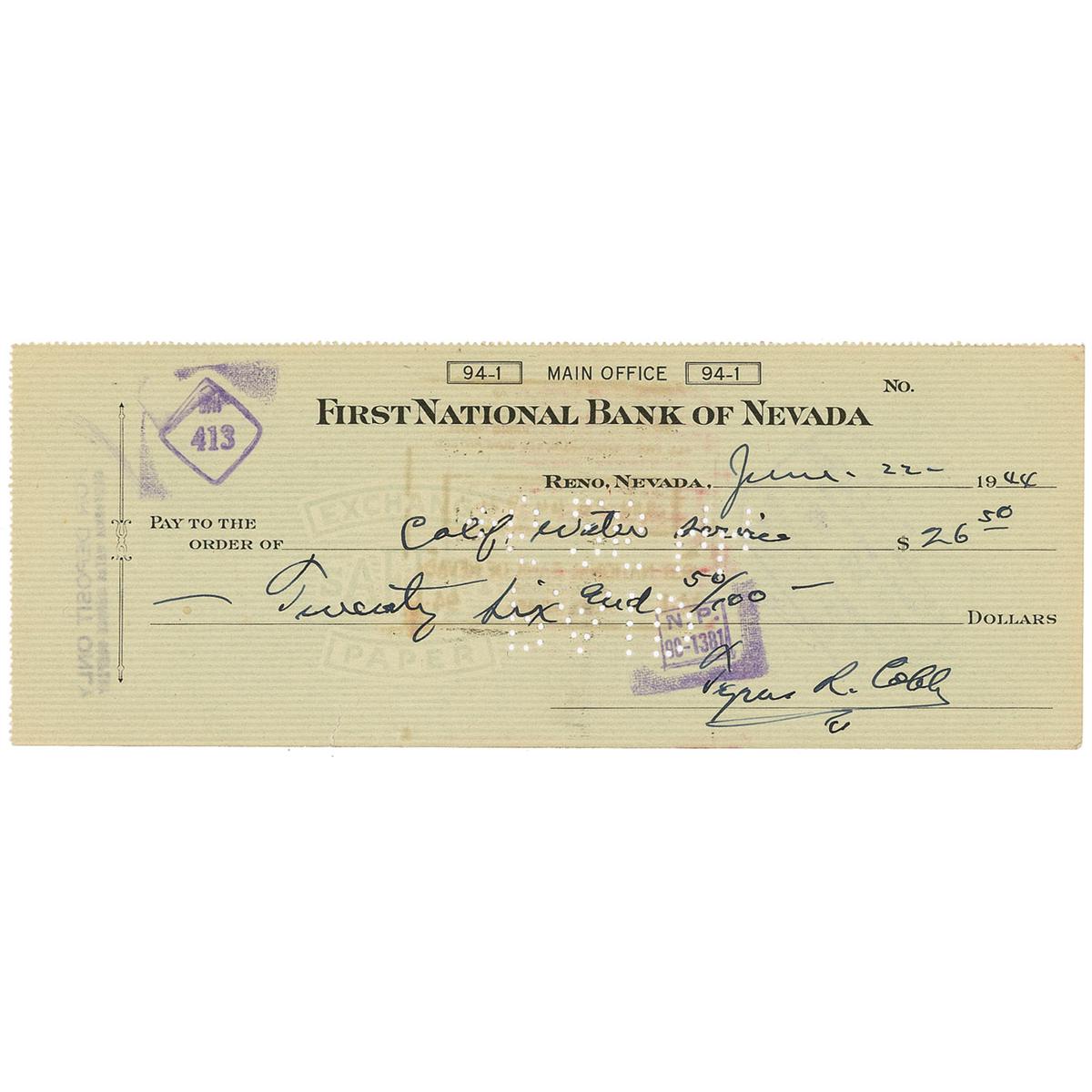Bank check, 8.25 x 3.25, filled out and signed by Cobb, “Tyrus R. Cobb,” payable to Calif. Water Service for $26.50, June 22, 1944. Expected stamps and holes, one stamp affecting beginning of signature, and show-through from stamp on reverse, otherwise fine condition.