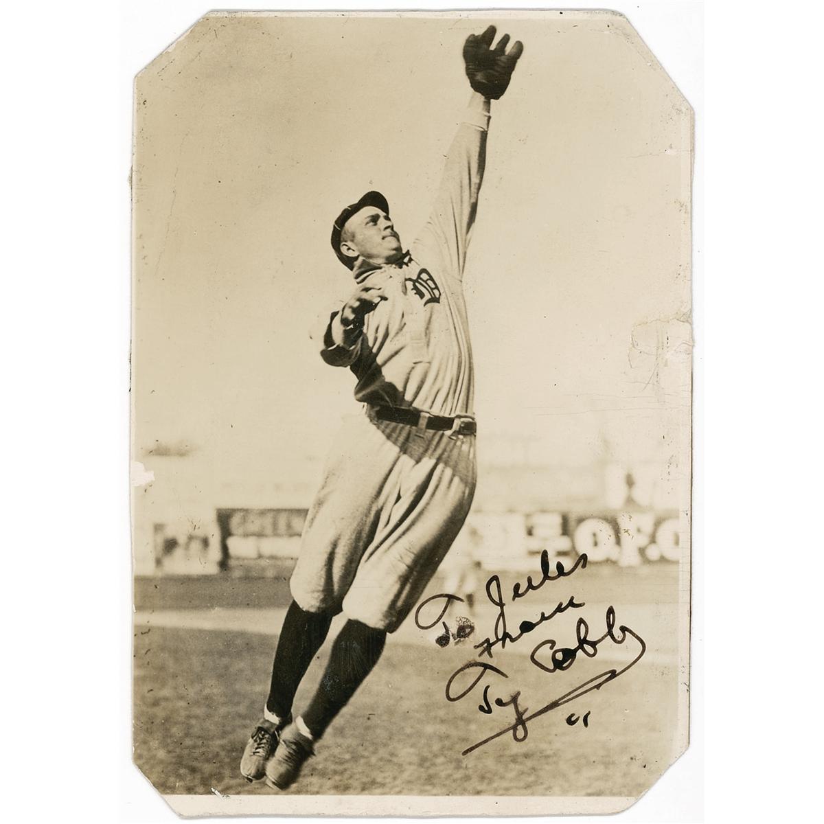 Vintage pearl-finish 4 x 5.5 photo of Cobb leaping into the air to make a catch, signed and inscribed in fountain pen “To Jules from Ty Cobb.” Clipped corners and lightly trimmed edges, scattered creases and wrinkles, a couple small brushes to signature and inscription, adhesive remnants to reverse, and some light silvering to image, otherwise very good condition.