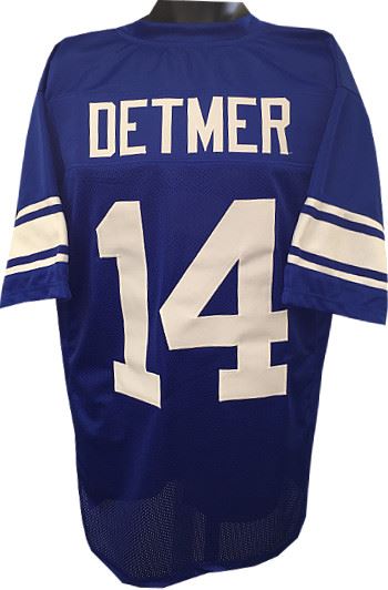 Ty Detmer entered the national spotlight during his record-setting career at BYU. He started a game against New Mexico, and passed for 333 yards and 5 touchdowns in a 65-0 BYU victory. He was named Most Valuable Player of the 1988 Freedom Bowl, leading BYU to a come-from-behind 20-17 victory over Colorado. Detmer's junior season (1990) ranks as one of the greatest seasons for a quarterback in college football history. Detmer passed for 5,188 yards and 41 touchdowns in 12 regular season games, and finished the year with 42 NCAA records (and tied for five others). For his efforts, Detmer was awarded the Heisman Trophy, and received many other honors (including the Maxwell Award and the Davey O'Brien Award). This is a Ty Detmer BYU Cougars unsigned Blue unlicensed custom-prostyle jersey with twill stitched nameplate and numbers. perfect for autograph or to wear! Size XL