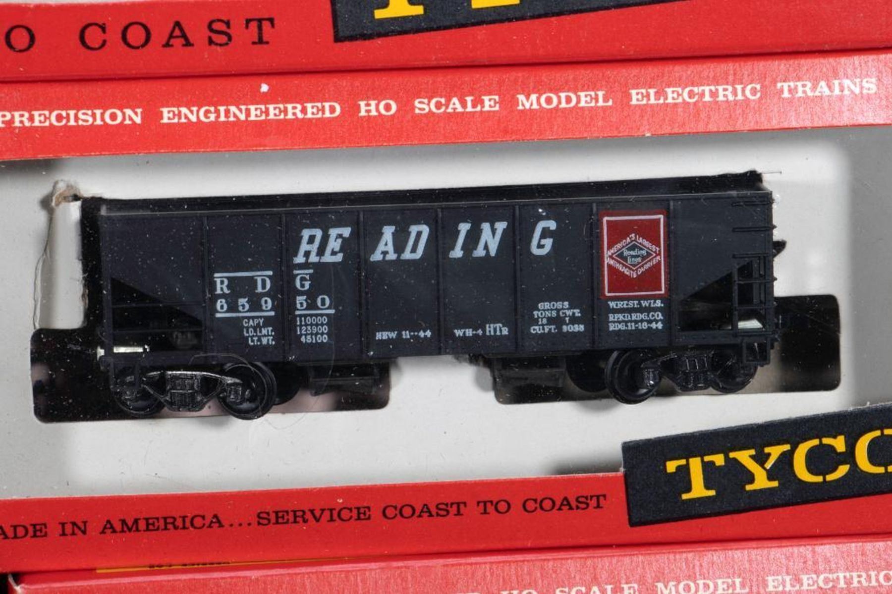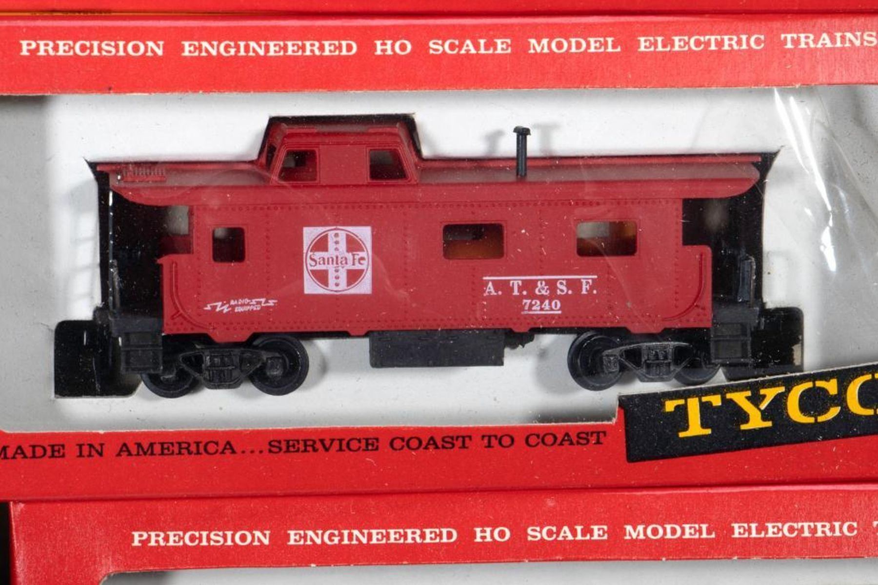 Tyco HO Set. Santa Fe 4-6-2 Steam Locomotive and Tender. Missouri Pacific Stock Car, NYC Box Car, Swift Reefer, Navy Flat Car, Reading Hopper and Santa Fe Caboose. Track and power pack.