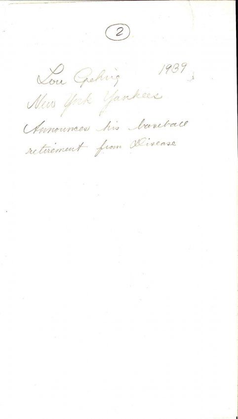Original type 1 photograph of Lou Gehrig from 1939 announcing his farewell from baseball. This is a great up close photograph of Lou Gehrig, that any baseball fan would love to add to their collection. This photograph measures 5.5 x 10 inches.