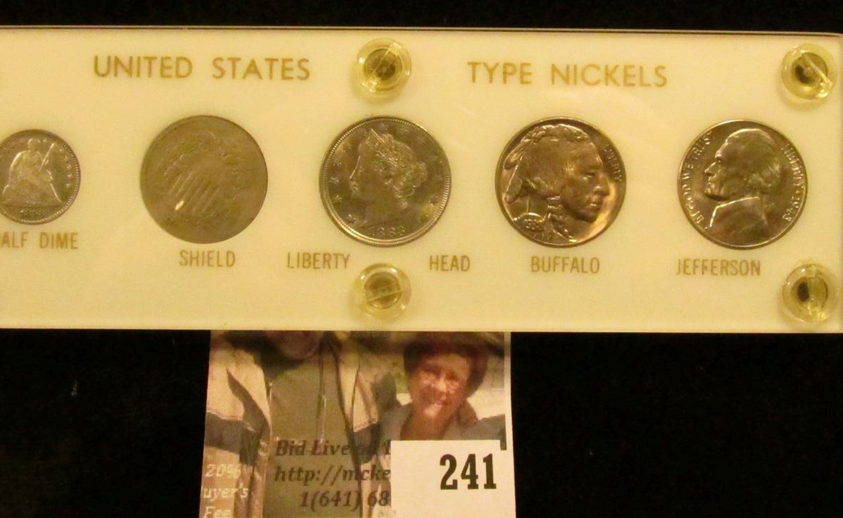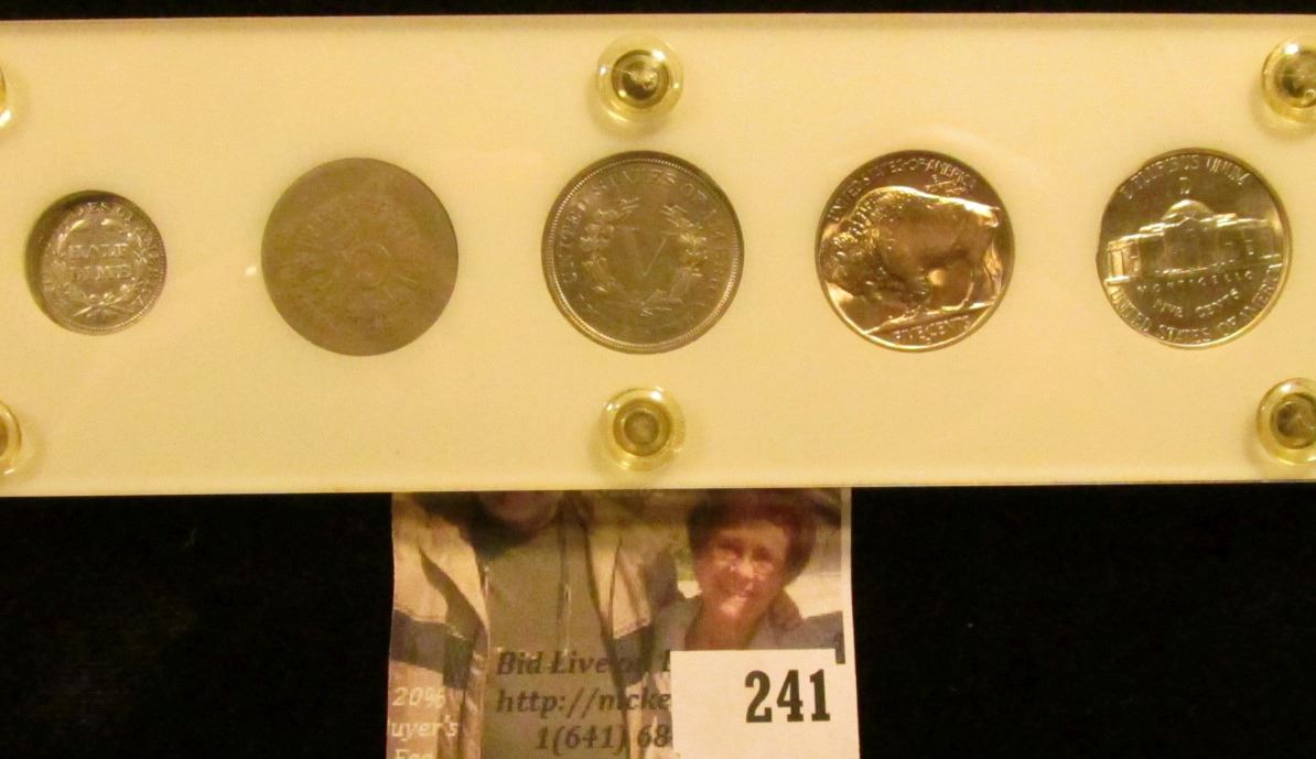 Type Set of U.S. Five Cent Pieces: 1858 Half Dime VF-EF,; 1866 with Rays G-VG; 1883 "no cents" AU; 1938 D Buffalo gem BU with gold & purple toning; & 1943 D Silver War Nickel BU with nearly Full Steps.