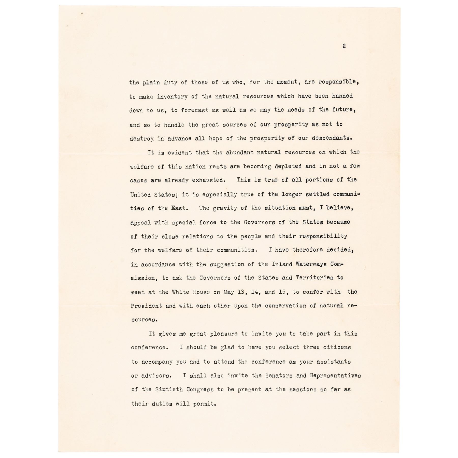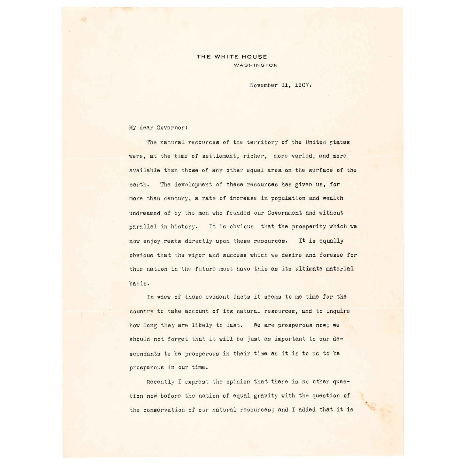 Facts, which I cannot gainsay, force me to believe that the conservation of our natural resources is the most weighty question now before the people of the United States. If this is so, the proposed conference, which is the first of its kind, will be among the most important gatherings in our history in its effect upon the welfare of all our people. --- I earnestly hope, my dear Governor, that you will find it possible to be present. --- Sincerely yours, (Signed) Theodore Roosevelt”.