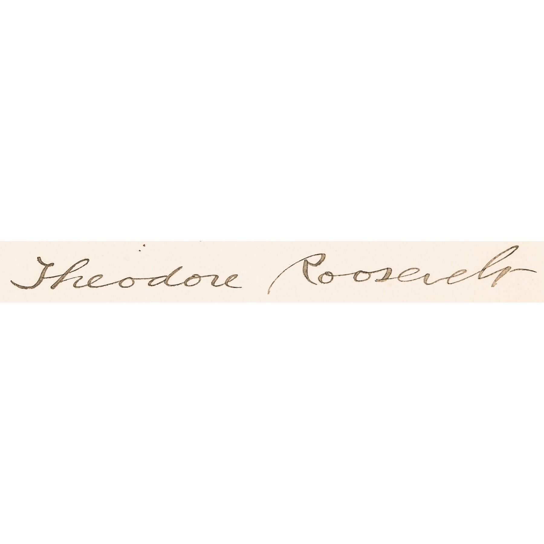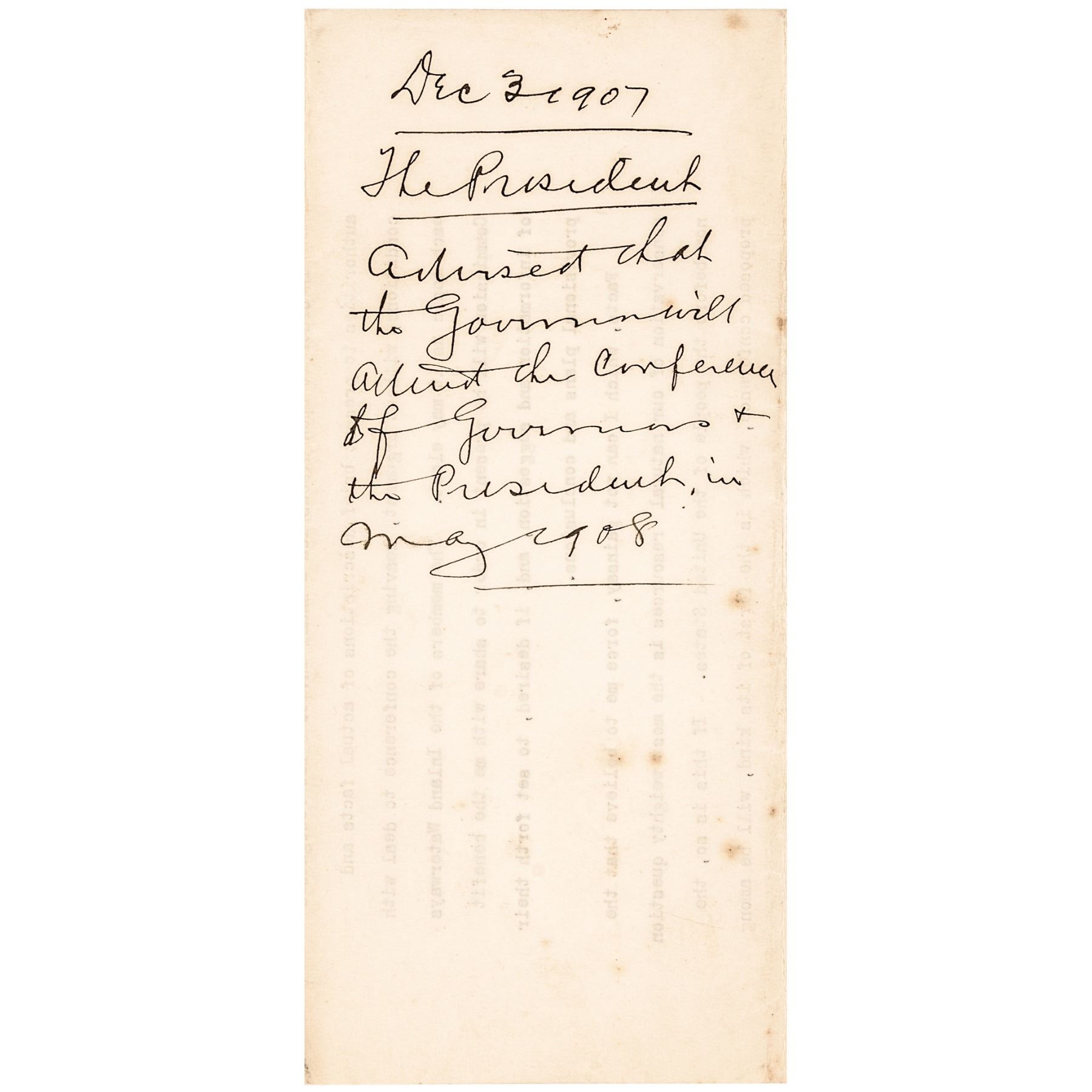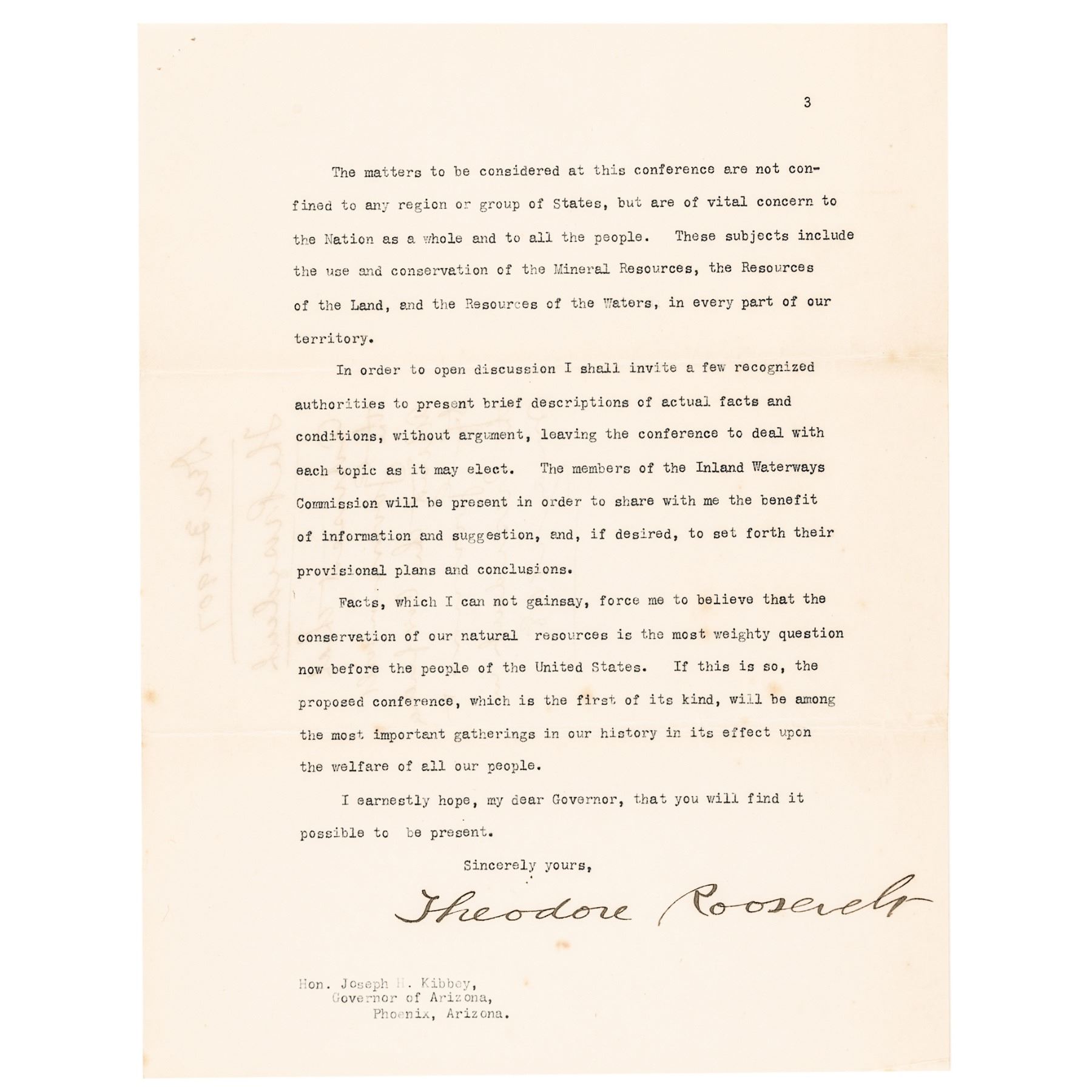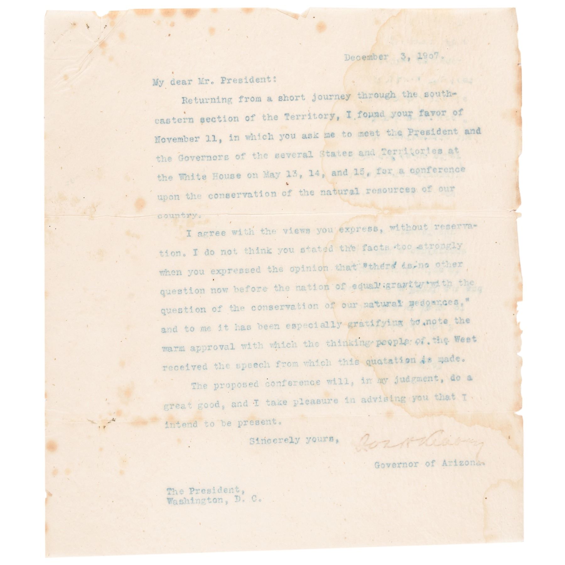November 11, 1907-Dated, Important Content Typed Letter Signed, “Natural Resources of the territory of the Unites States” Signed, “Theodore Roosevelt” as President, 3 pages, measuring 10.5” x 8”, at Washington, Choice Extremely Fine. This Letter is to Joseph H. Kibbey, Governor of Arizona, upon official White House stationery. It is sent together with a December 3rd, 1907 Joseph H. Kibbey Typed Letter Signed, 1 page, stating Kibbey will attend the conference regarding protecting our nation’s natural resources being organized by Roosevelt. This exact “Theodore Roosevelt” Presidential Letter previously offered as Lot 1103 of our EAHA Auction of May 20, 2016 where it sold for $23,370. Roosevelt writes about conservation, in full: