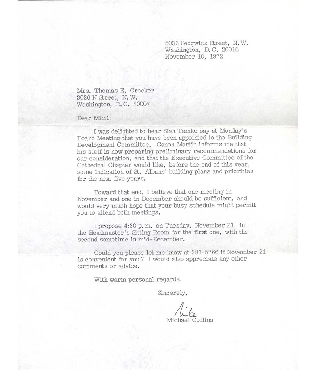 Typed letter signed by American astronaut Michael Collins, who flew on both the Gemini 10 and Apollo 11 flights. The letter, dated 10 November 1972, was written the year after Collins became the director of the National Air and Space Museum. In the letter he asks the recipient to join a committee. Intimately signed ''Mike'', letter measures 8'' x 10.5'' and has expected folds from mailing; fine condition.