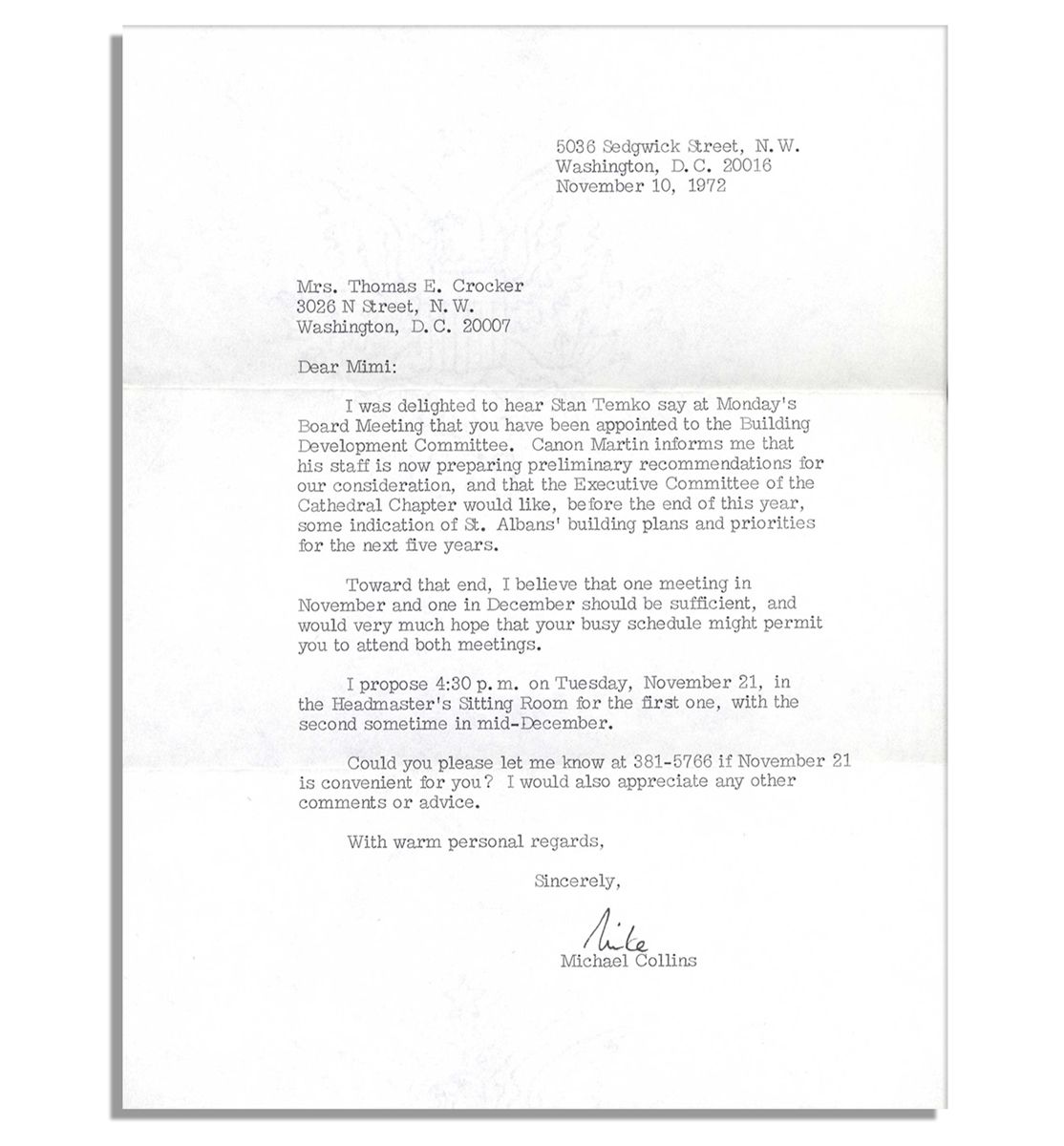 Typed letter signed by American astronaut Michael Collins, who flew on both the Gemini 10 and Apollo 11 flights. The letter, dated 10 November 1972, was written the year after Collins became the director of the National Air and Space Museum. In the letter he asks the recipient to join a committee. Intimately signed ''Mike'', letter measures 8'' x 10.5''. Expected folds from mailing, near fine condition.