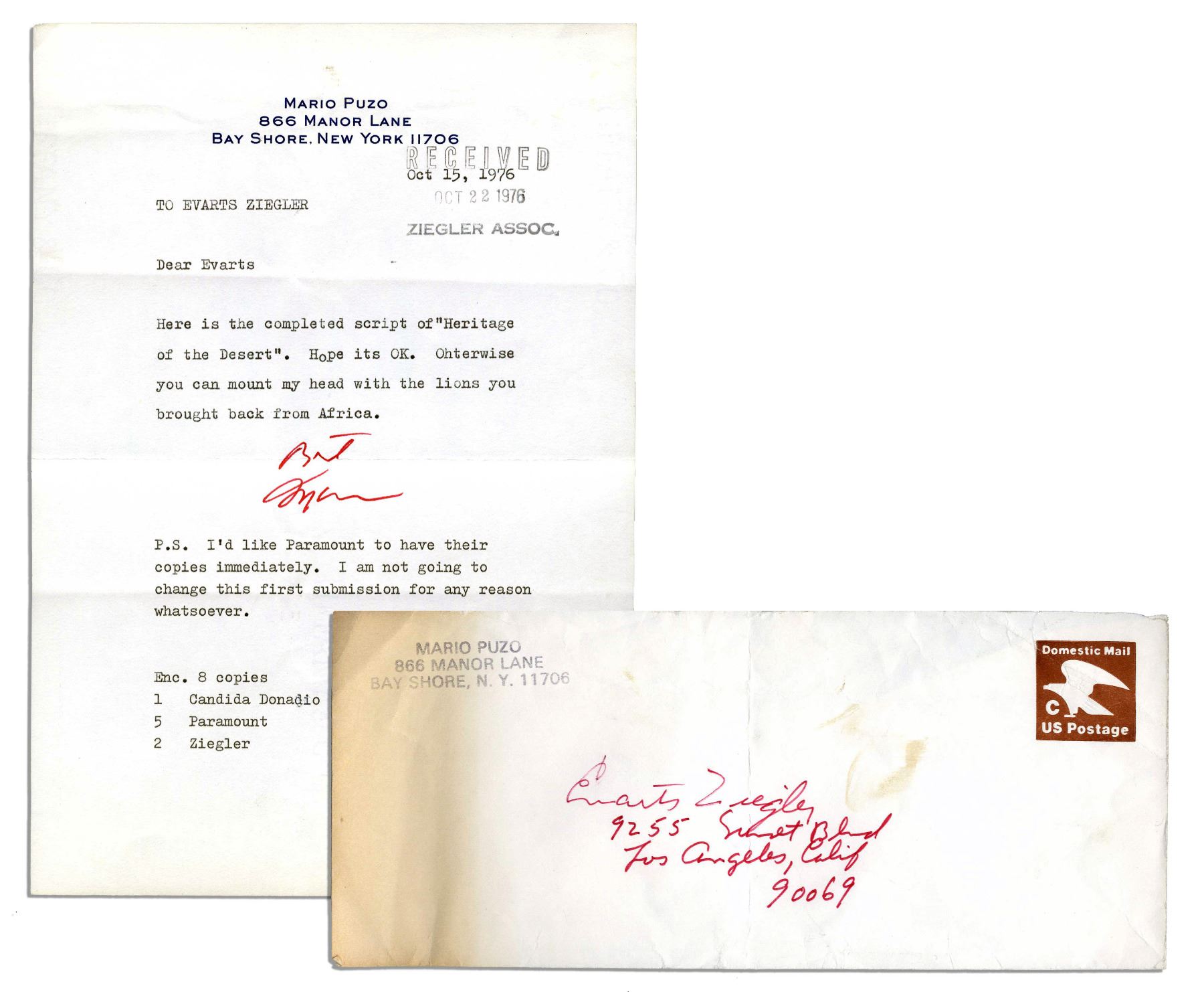 Typed letter signed by ''The Godfather'' author Mario Puzo, on his personal letterhead, dated 15 October 1976. Puzo writes to his literary agent Evarts Ziegler, ''...Here is the completed script of 'Heritage of the Desert'. Hope its [sic] OK...Otherwise you can mount my head with the lions you brought back from Africa...'' Letter is signed in red ink ''Best Mario''. Puzo continues with a ''P.S. I'd like Paramount to have their copies immediately. I am not going to change this first submission for any reason whatsoever.'' Measures 6.75'' x 9.75''. Accompanied by envelope with Ziegler's address written by Puzo. Letter contains horizontal folds, otherwise near fine condition.