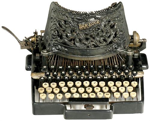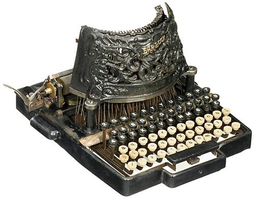 "Bar-Lock Mod. 1b", 1888 Sehr seltenes Modell mit gußeiserner, reich verzierter Typenkorb-Verkleidung. Erfunden von Charles Spiro, dem New Yorker Uhrmacher, der bereits die "Columbia Index" konstruiert hatte. Hersteller: Columbia Type Writer Mfg. Co., New York. Rahmenbruch fachmännisch repariert. Nur die 3 bekannten Modelle mit dem großen "B" in der Mitte des Vorbaus - also dem eigentlichen Mod. 1 - liegen zeitlich vor diesem Modell. - Literatur: Martin, 1949, S. 102. - Eins der ganz bedeutenden Sammlungsstücke!