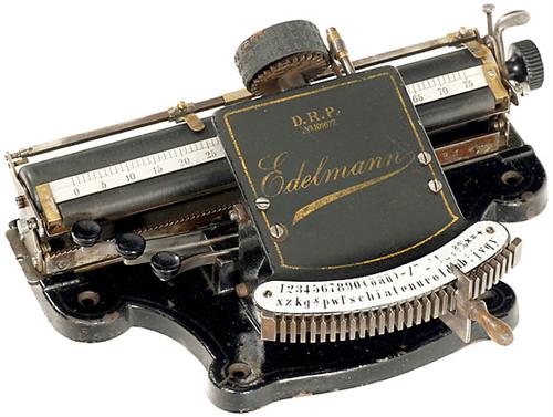 "Edelmann", 1897 Sehr gesuchte, deutsche Typenrad-Zeiger-Schreibmaschine mit Farbröllchen-Einfärbung und Email-Skala. Vom "Alleinigen Fabrikanten Julius Pintsch, Frankfurt/M." - Literatur: Martin, 1949, S. 164. - Sehr interessantes Sammlungsstück.