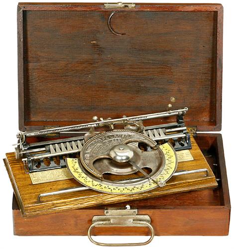 "World No. 2" (Pope-Modell), 1886 Frühe amerikanische Zeigerschreibmaschine mit halbrundem Index. - Literatur: Martin, 1949, S. 93. - Guter Zustand. - Sehr dekorativ. Mit Original-Holzkasten.