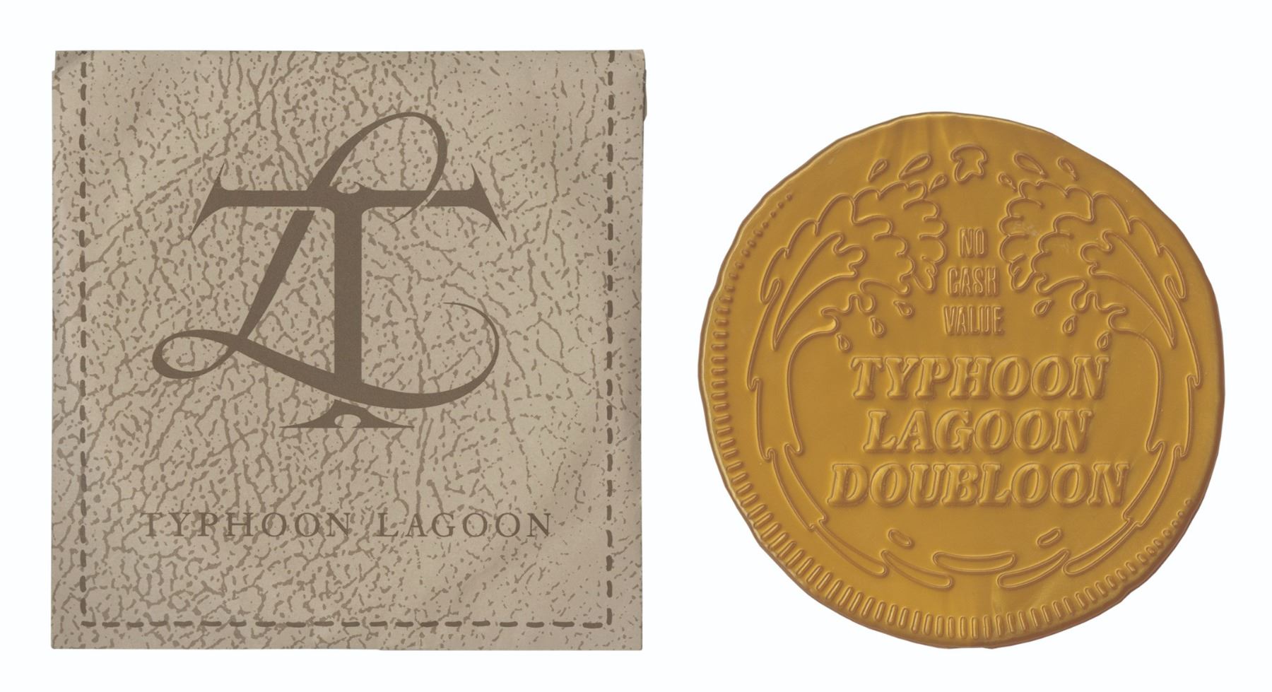(Walt Disney World, 1990s) A souvenir coin from the Typhoon Lagoon water theme park. The token reads "Typhoon Lagoon Doubloon" on both sides, with one side indicating no cash value. The doubloon is made of plastic and comes with its original envelope. Measuring 3" in diameter, this souvenir token is in very good condition with minor wear. The envelope measures approximately 3.5"x3.5" and is in good condition with some creasing.