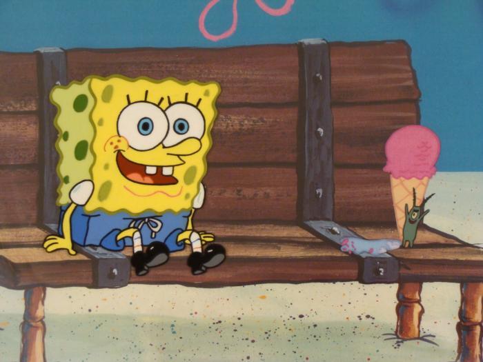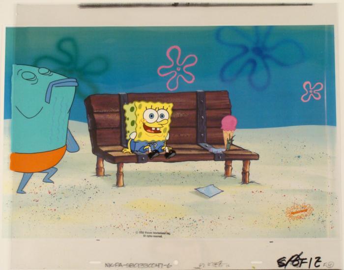 This original animation cel and reproduction background are from the Nickelodeon TV show SpongeBob Squarepants. The story takes place under the deep blue sea in Bikini Bottom, where SpongeBob resides. SpongeBob, who is a yellow, porous sponge, is your typical happy-go-lucky character, as he is always cheerful and enjoys making people laugh. Patrick Star, SpongeBob's neighbor who is a starfish, is your average children's show idiot, as he boasts knowing nothing and is often getting himself into ridiculous situations. Between the homes of these two lies the home of the miserable Squidward, a squid, who is known for being grouchy and playing tricks on SpongeBob and Patrick. Both SpongeBob and Squidward work at the Krusty Krab, a fast food business run by the greedy money-loving Mr. Krabs, a crab, the arch rival of the evil, possibly misunderstood, Plankton. Another neighbor, Sandy Cheeks, an athletic squirrel who normally wears an astronaut's space suit, was introduced in "Tea at the Treedome." She spends most of her time inventing and experimenting. Just a typical day at Bikin BottomOriginal Animated Cel and Reproduction Background Overall Size of Background: 11" x 17" Overall Size of the Cels: 13 1/2" x 16 1/2" Excellent conditionThis is an original hand-painted cel set-up used in the production of an episode of "SpongeBob SquarePants." Each one-of-a-kind set-up represents a slight change in position of the characters. When individually photographed and projected in rapid succession, the images appear to move.